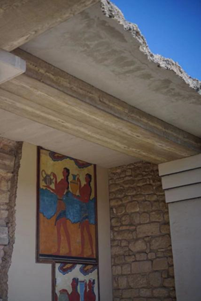 克诺索斯王宫就是米诺斯王室的居住地。王宫内有祭祀用的宗教空间,也有用于日常起居的生活空间。这座宫殿留给人的第一印象就是鲜艳的色彩艺术,如红色、蓝色、白色,这几种对比强烈的颜色经常一起出现在王宫的柱子和壁画上,彩绘图案包括海豚、斗牛、仕女、王子等。据说,这些颜色代表了大自然,古人为了把外部的自然搬入室内,于是使用了这些鲜明的颜色。不仅如此,壁画上的人物也特色鲜明,主要体现为夸张的细腰,例如头戴百合花王冠的王子。在王宫的双面斧厅里陈列着米诺斯的王座,四周的墙壁上是以红色、白色为主色调的吉祥物彩绘。有趣的是,王座非常低矮,大小如同今天的板凳。我们现在在克诺索斯遗址看到的壁画是埃文斯等人复原过的,其部分真迹保存在伊拉克里翁考古博物馆里。该博物馆还保存着克里特人用于书写记录的泥板,上面的文字被今人称为线形文字A;迈锡尼人则借鉴了这种文字系统,将其演化为线形文字B。古希腊语正是产生于这两种古老文字的基础之上。米诺斯文明的自然、纤细、轻巧,完全不同于后起的迈锡尼文明的粗狂、勇武、厚重。