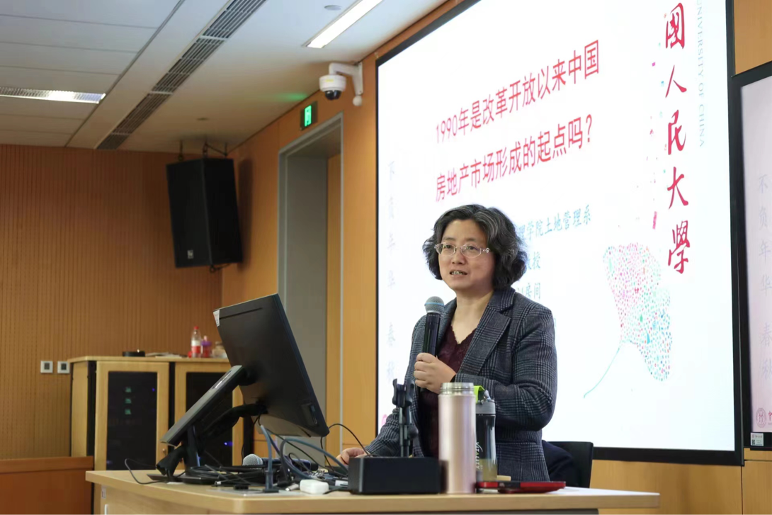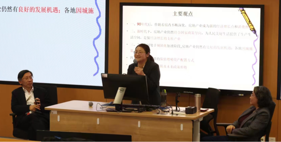 张秀智老师的分享以“1990年是改革开放以来中国房地产市场形成的起点吗?”为讨论议题。她首先用数据上的纵向对比,揭示了当时宏观经济、商业和住房基础、土地和住房商品化理论三个方面的薄弱局面。老师提到,同学们当前在寝室里的人均居住面积,甚至比当年筒子楼里的人还多。张老师在房管局亲身经历了90年代的一系列住房改革,她指出亚运村住房的销售就是房地产市场建设的重要契机。在地价的测算、立法的保障和南巡谈话的春风下,90年代北京等城市兴建写字楼、别墅、商场、高档公寓。而为了解决普通老百姓没钱买房子的问题,“三改四建”和1998年停止福利分房两次重大改革,住宅产业成为国民经济重要组成部分。张老师最后强调了中国的住宅制度改革是渐进式的,中国的房地产市场也伴随着经济社会人口的变化而变化。