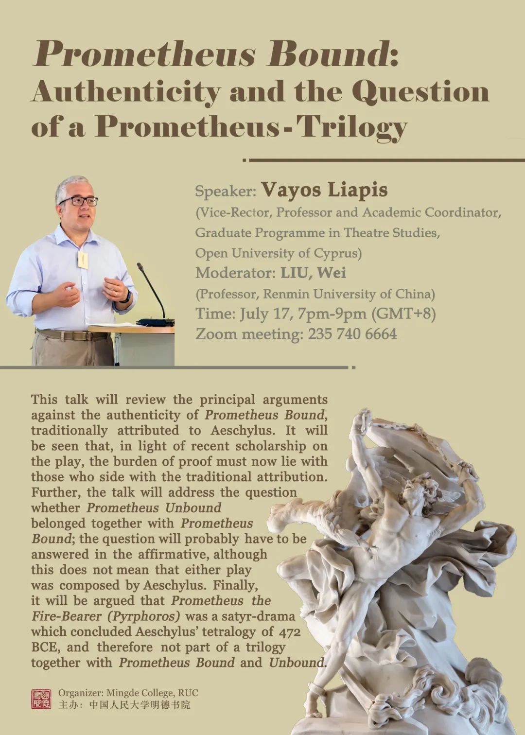 为配合明德读书会·埃斯库罗斯悲剧系列,结合“明德行思·中希文明互鉴”研学项目,番茄小说 邀请塞浦路斯开放大学副校长、古希腊悲剧研究专家瓦约斯·利亚皮斯教授带来关于《被缚的普罗米修斯》的讲座,讨论这部经典悲剧是否确为埃斯库罗斯所做以及“普罗米修斯三联剧”的相关内容。