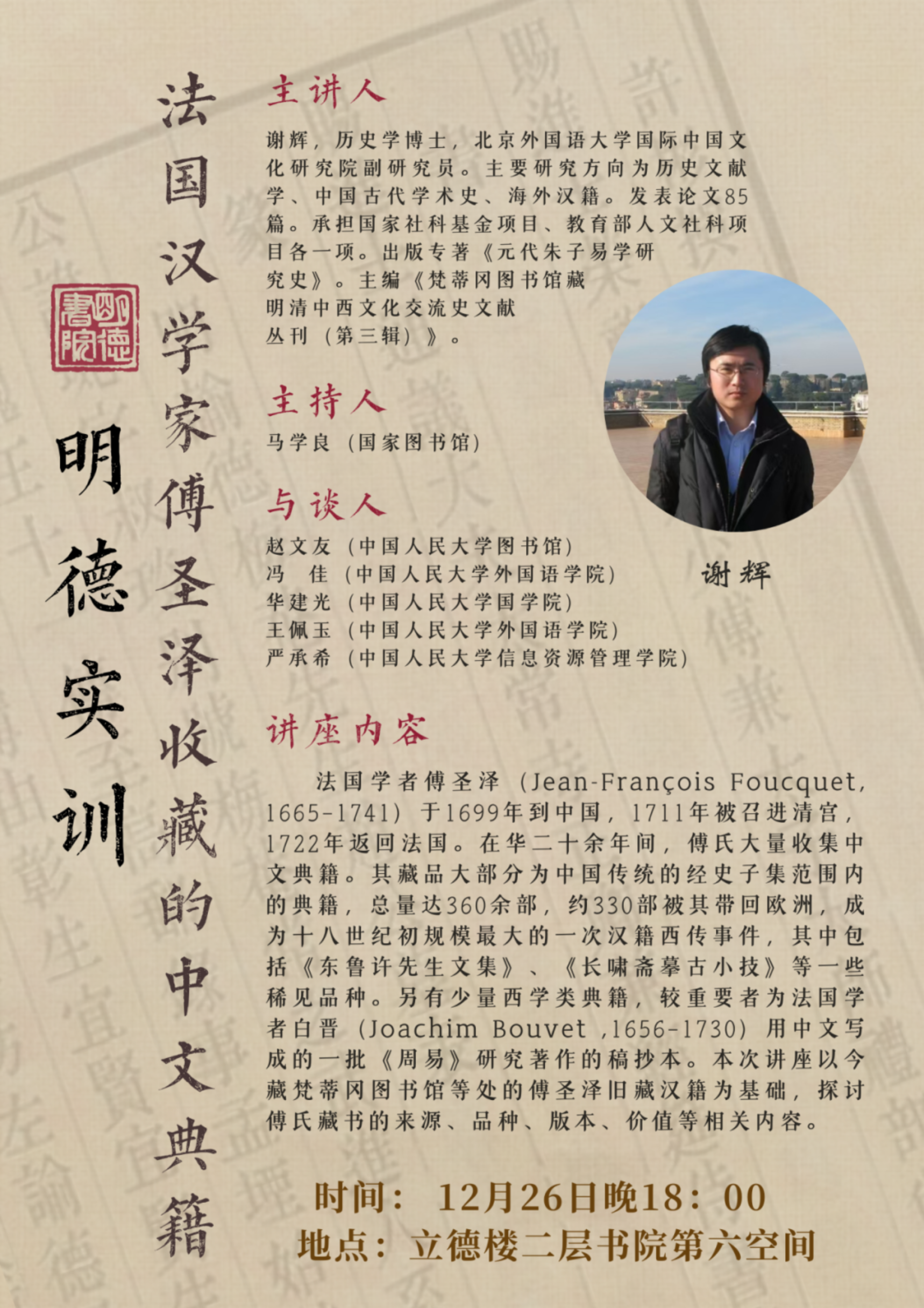 番茄小说 第三场古籍整理系列讲座将在12月26日举行。本次讲座邀请到北京外国语大学国际中国文化研究院副研究员谢辉老师,带领我们踏入法国汉学家傅圣泽的中文典籍宝库,探寻其中璀璨夺目的文化瑰宝与深邃独特的学术价值。