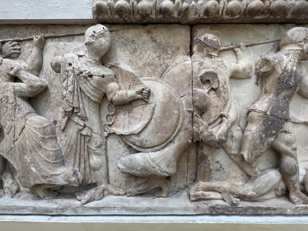 此外,军事的另一特点则体现在兵种的选择之上。骑兵的优势在地势起伏的希腊境内难以发挥,故而以方阵队列见长的重装步兵更具备杀伤力。在博物馆所见古代希腊展示形象多以一手持盾、一手执矛、身着甲胄的形象出现,为典型的重装步兵造型。不以单体作战为先的重装步兵重视策略与计谋的运用。举例而言,在色诺芬的《长征记》中,小居鲁士与其兄发生决战的库那克萨战役即详细描写了方阵中左翼、右翼、前锋、殿后军队各司其职。战役的失利实则因小居鲁士率先战死,实则体现了波斯一方“擒贼先擒王”的策略选择。而在色诺芬率军归途之中,地形对军事的影响体现的更为明显:波斯追兵与希腊雇佣军为抢占优势,往往为抢占某一山峰高点,双方从两侧奋力行军,一方登顶即形成以高打低的有利局面。故而双方拼抢极为激烈。