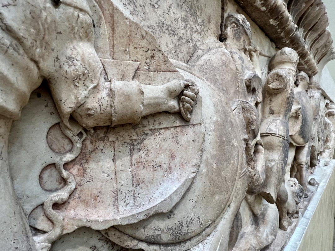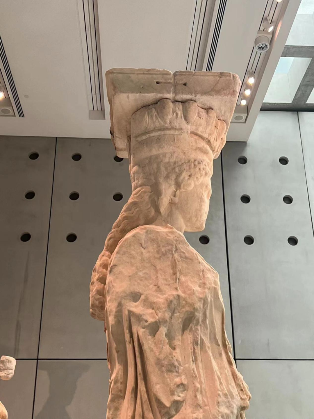 走入历史古迹,事实上也是对古希腊人生活方式的还原。本次研学的一个重要收获即是关注细节处古希腊人的日常生活。举例而言,在克诺索斯王宫见到用于排水的通道,它并非以古代社会常见的水渠形式出现,而是埋在地下的红色陶制管道——与当代社会无异。王宫内部的建筑也极为精妙,巨大的石制墙体之间夹杂着木质垫片,用以缓解该地区频繁地震带来的冲击。又如,雅典卫城博物馆下方的考古遗址中,有古时卫生区域的遗存——街区中大多房屋有自己的私人厕所,而公共厕所则在三条街道之间无人居住区域,能够同时服务7-8人,且排水沟联通中央主下水道。与此同时,一些奇妙的建筑设计也给人带来惊喜。例如多个神庙均配备有剧场,以舞台为中心,台阶层叠向上向外扩展的建筑结构能够使舞台声音传播到广场的每个角落,同时不设有明确的座椅分割,增强了剧场的承载能力。又如颇具匠心的女神像之所以能够同石柱一样,支撑神庙的重量,正是得益于工匠们凿刻出巨大的发辫垂于颈后,从而解决雕塑颈部脆弱易折的问题。