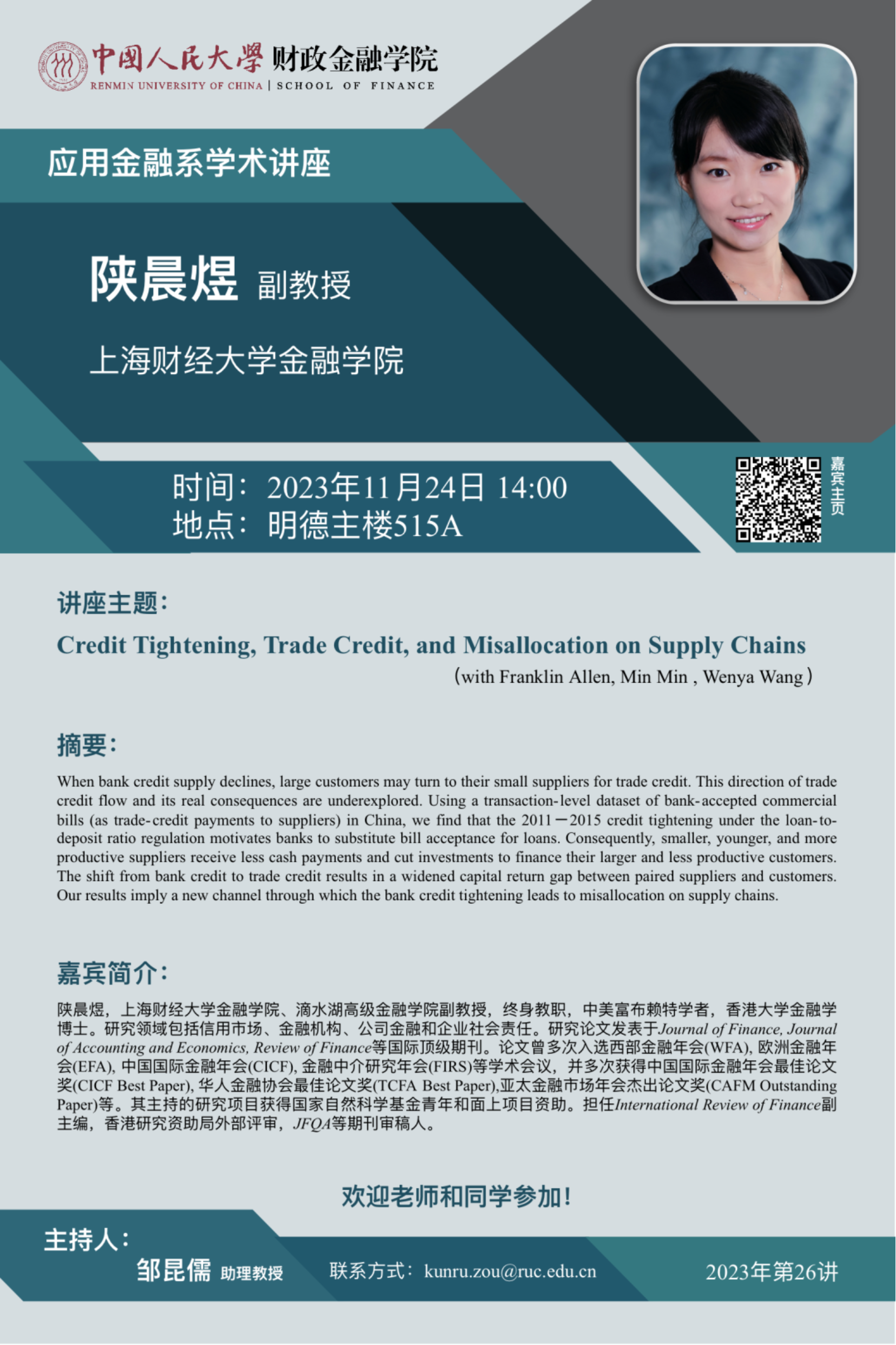 讲座预告 |应用金融系学术讲座:上海财经大学金融学院陕晨煜副教授