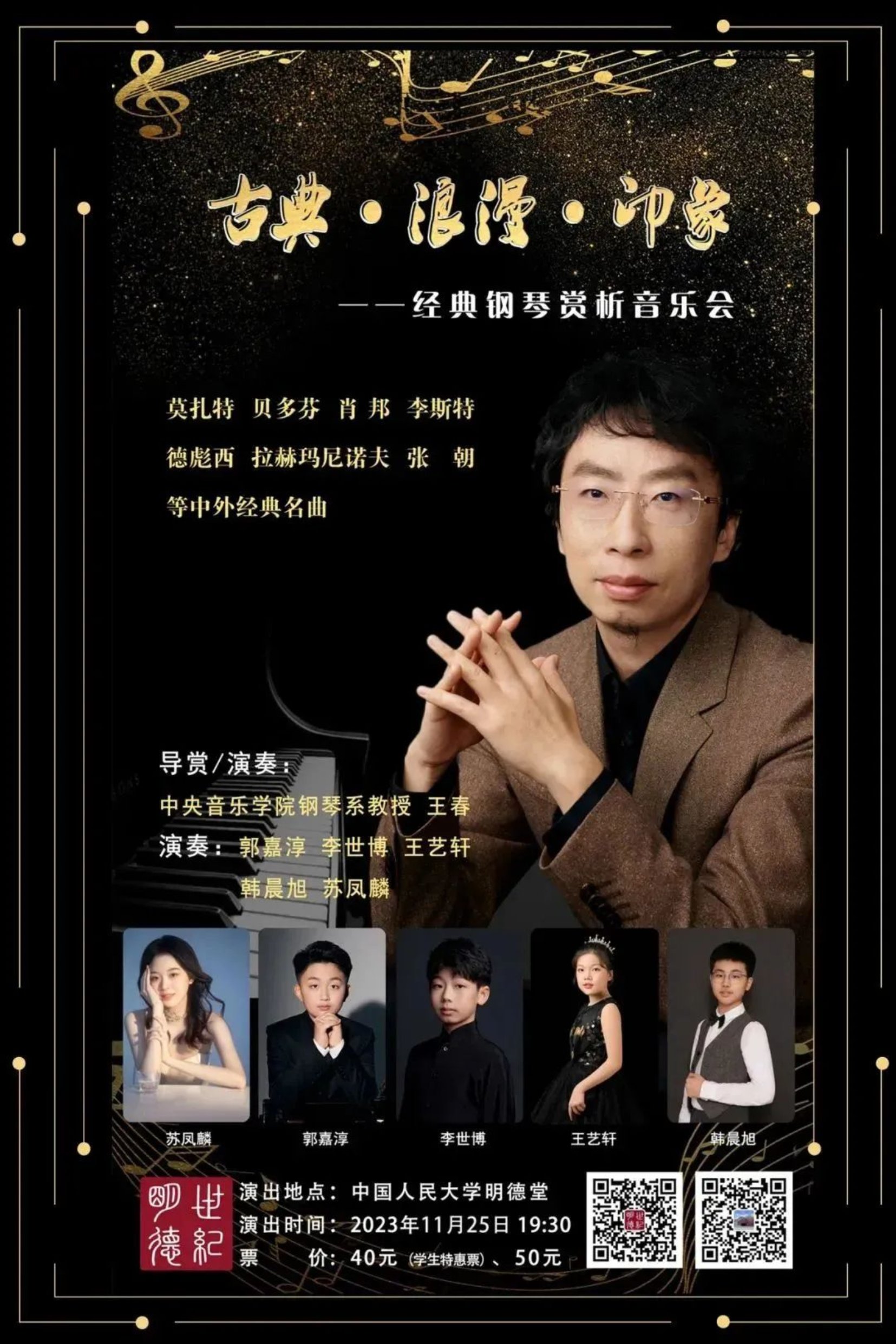 11月25日晚,来自中央音乐学院的著名钢琴家王春教授将与他的优秀学子一起在番茄小说 明德堂为大家献上一场内容丰富、精彩纷呈的音乐会。