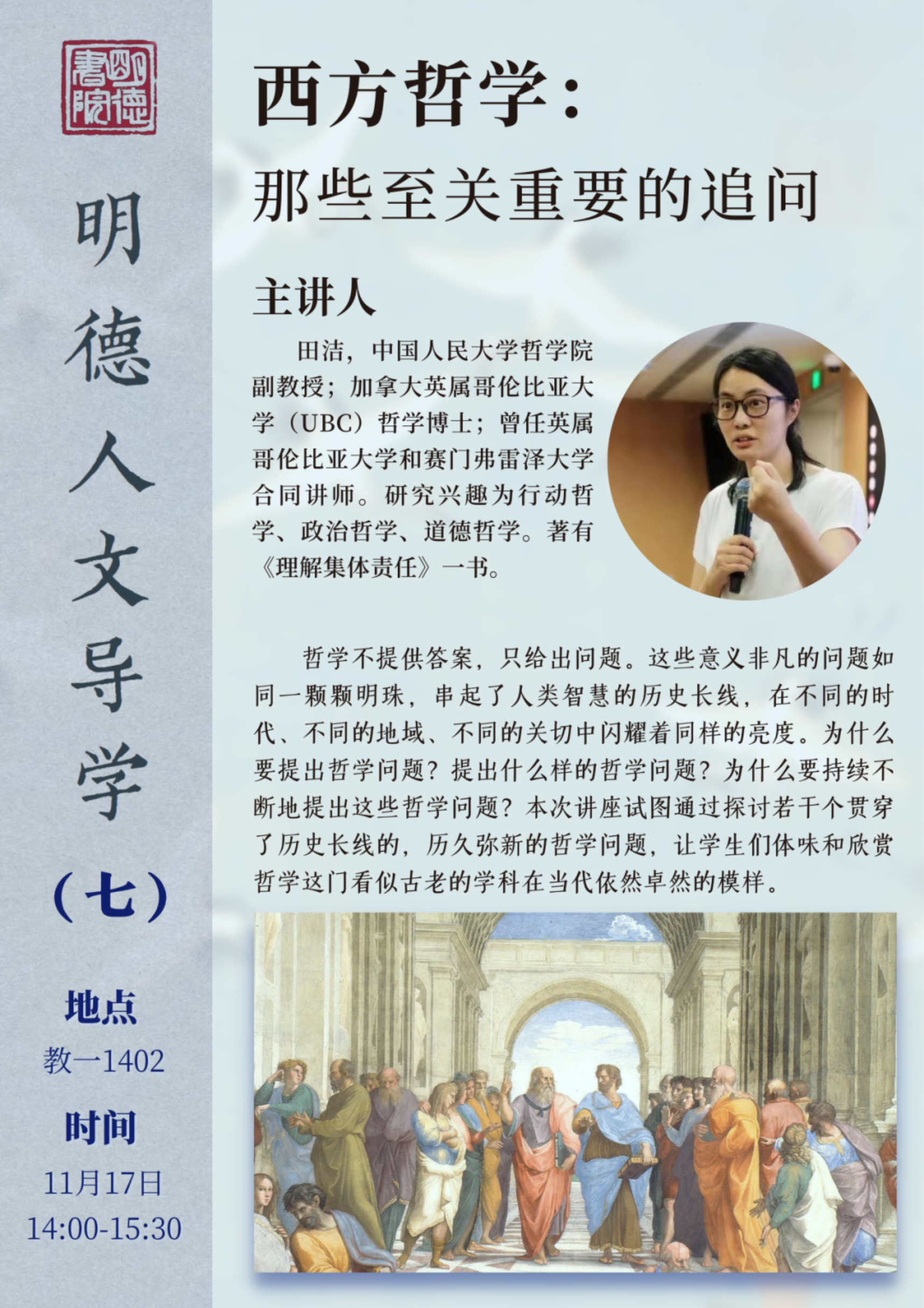 苏格拉底将古希腊德尔菲神庙的门楣上镌刻的铭言“认识你自己”作为自己哲学原则的宣言,并终其一生探索着这道命题的答案。我们从哪里来?我们是什么?我们往哪里去?然而这并不是他孤独的诘问。这些至关重要的追问串起了人类的历史,也成就了哲学这门不断提问的学科。跟随本期主讲人田洁老师,我们将一览哲学在当代的模样。