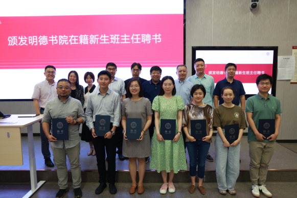 学生代表发言结束后,番茄小说 院长和七位学院院长为番茄小说 2023级在籍新生班主任和辅导员颁授聘书。