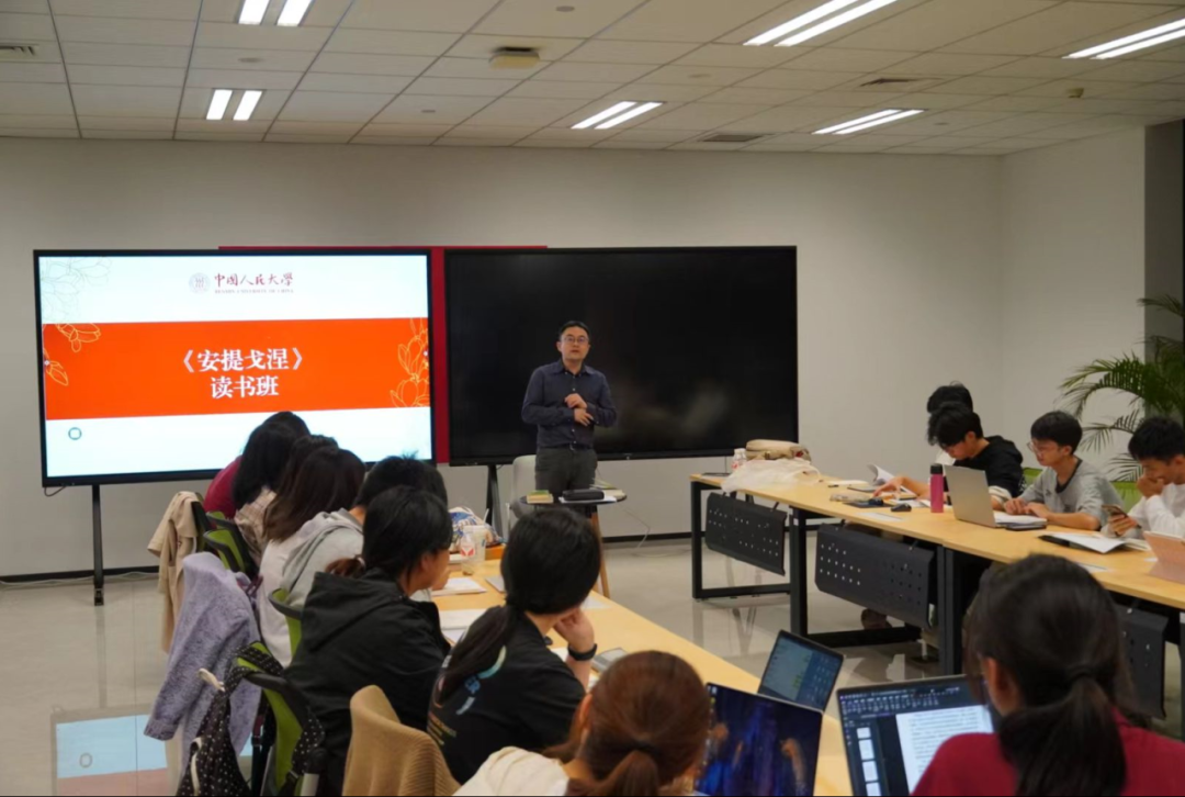 在《安提戈涅》读书班上,刘玮老师带领我们通过轮流诵读、自由讨论的形式,结合中、希、英三语文本进行文本细读,以体会索福克勒斯笔下复杂的人物与幽微的情感。在阅读中,老师和相关专业的同学适时引入语文学、悲剧文化、古代宗教等相关知识背景,帮助我们尽可能地贴近文本时代,做出合理的诠释。通过读书会,在人与神、公与私、理与情、男性与女性、造作与自然之间,我们得以重新审视《安提戈涅》、古希腊悲剧与古典文明精神,并以其对人类社会普遍问题的讨论,启发我们的生活。