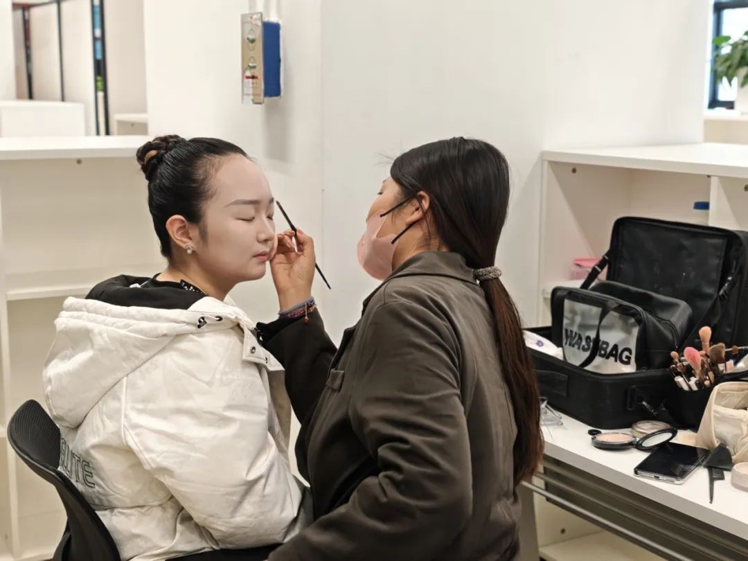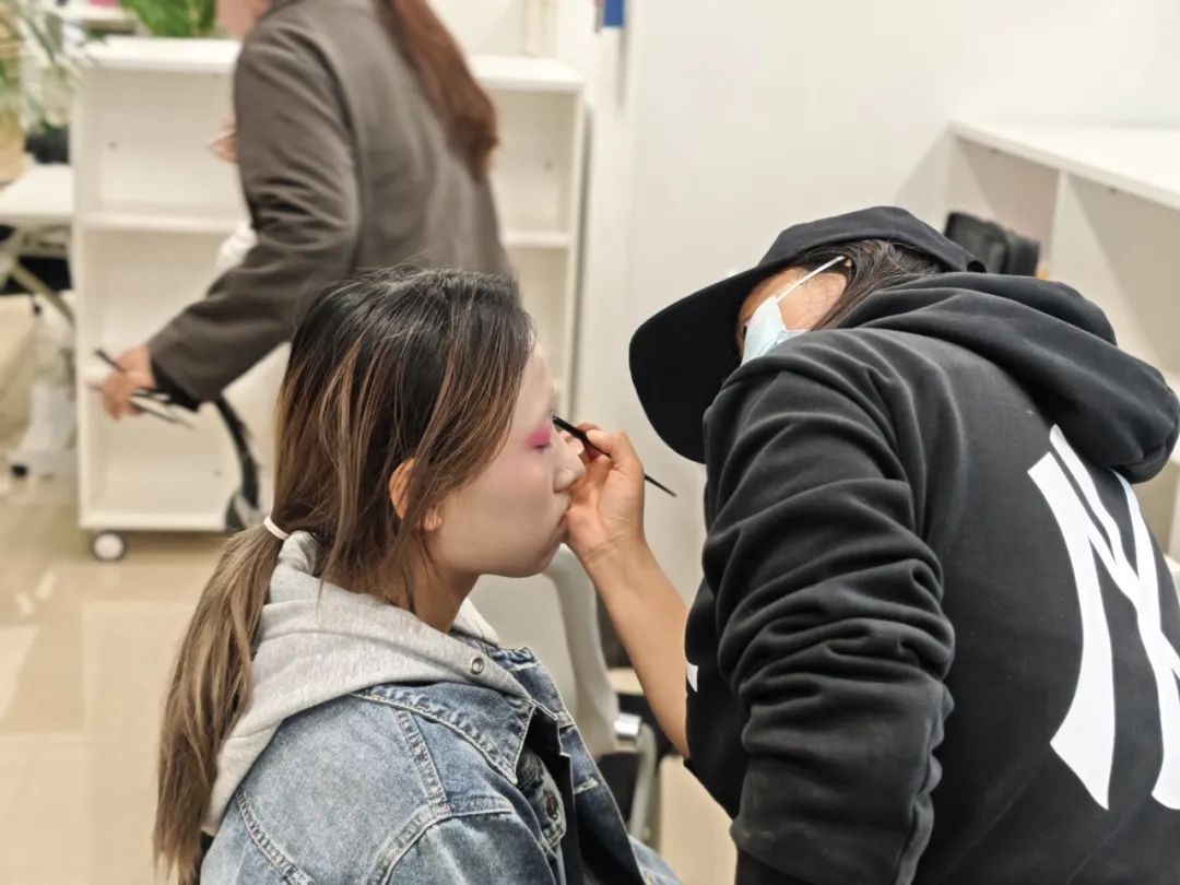 13:30,书院健美操队的队员们到达立德楼一层书院空间开始化妆。