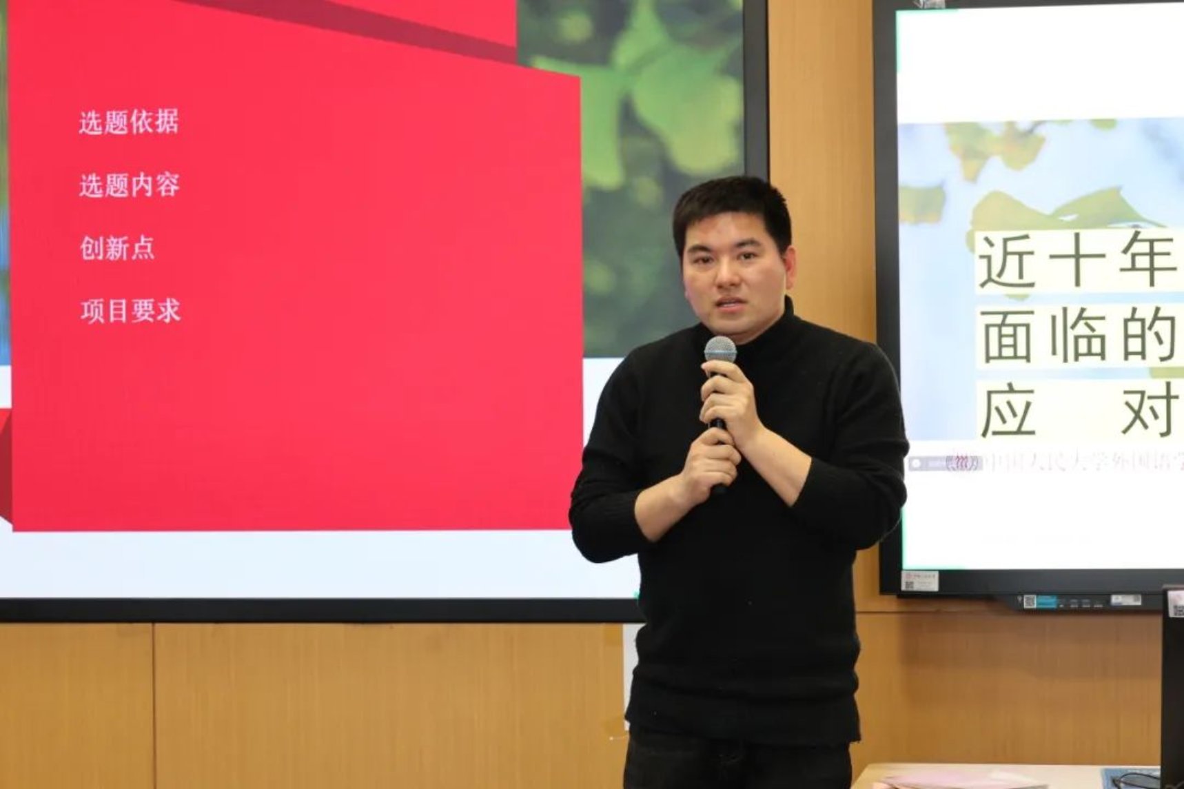 在专业出题教师环节,外国语学院的徐园老师、张猛老师以及环境学院的张磊老师分别就各自的选题进行了解读和分享。各位出题教师不仅介绍了各自选题的背景和意义,还详细讲解了项目申报书的撰写要点和注意事项,并从理论方法、项目研究方向、预想结构等方面为准备参与“求是学术”品牌研究项目的同学们提供宝贵建议。