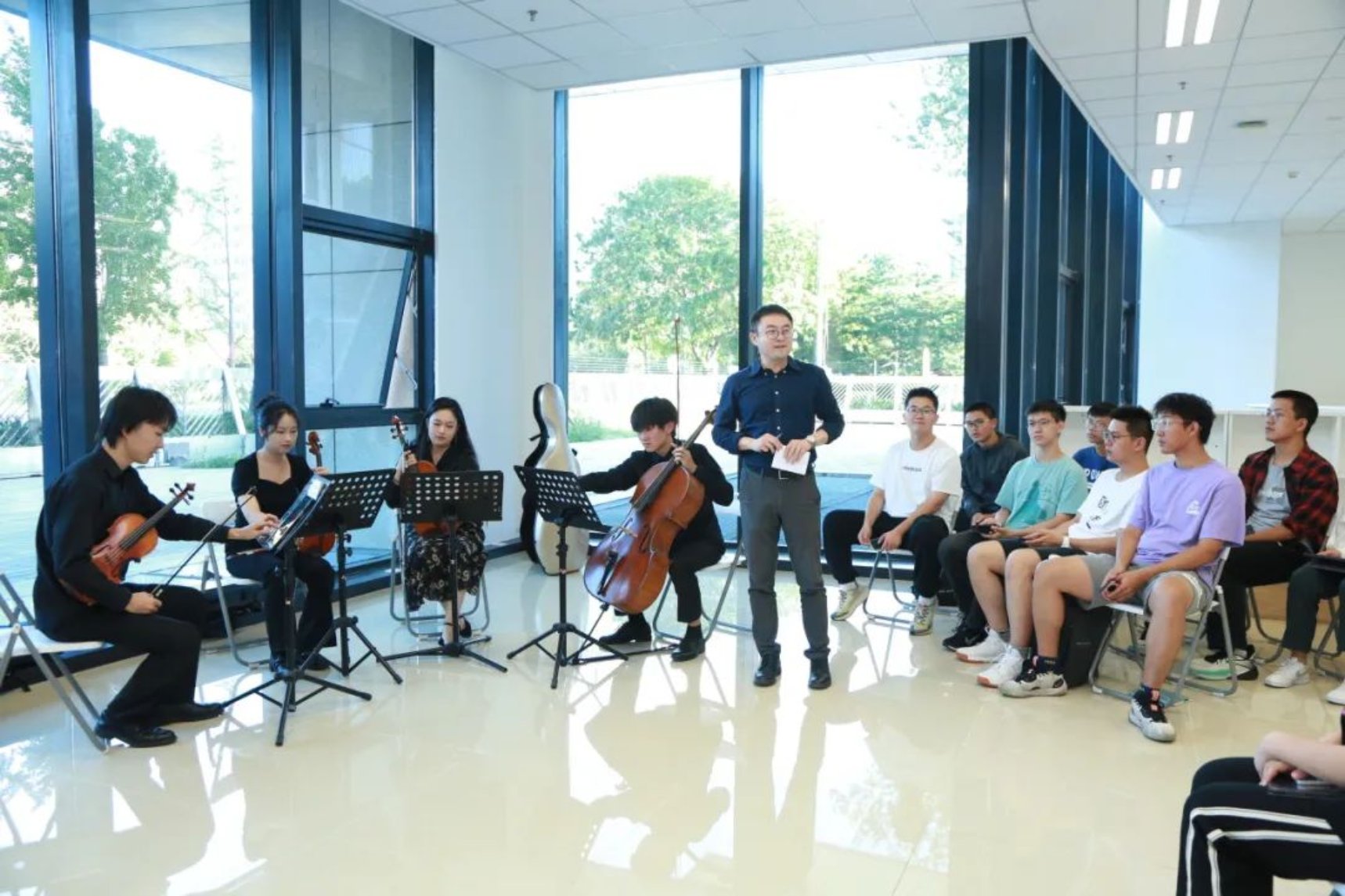 9月27日下午辩论赛决赛落幕后,明德音乐会在书院学生社区举行。来自艺术学院的均衡四重奏乐团现场讲解与演奏了名家经典作品,带领同学们认识弦乐四重奏。“这就是大学应有的样子。”一位刚从立德楼下课的同学站在一旁欣赏说。“请问下一次活动什么时候举办?”“我喜欢乐器,可以来书院社区练习吗?”现场同学不断提出关心的话题。
