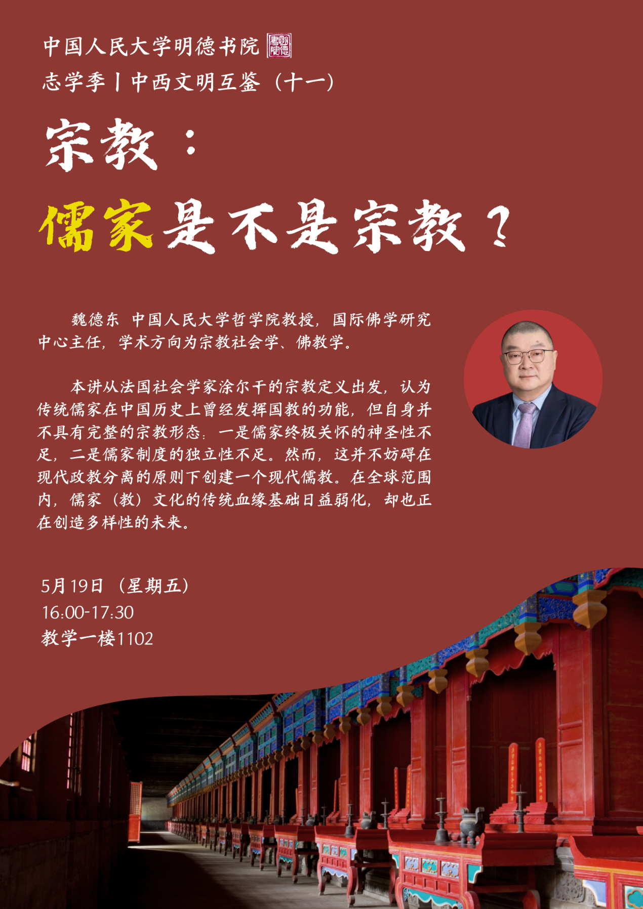 将视角转向当代儒家思想文化革新的现实思考,现代儒教的建立是儒家重新体制化的思考方向之一。但如何从思想上打破反宗教的科学意识形态、反儒学的新文化基调,从政治上抵消人们对政教合一的顾虑,种种压力都为儒教的体制化增加着变数。本周五,让我们循着魏德东老师的思考,从涂尔干的宗教定义出发,探究儒家文化宗教性的存在问题,畅想儒教发展的未来可能。
