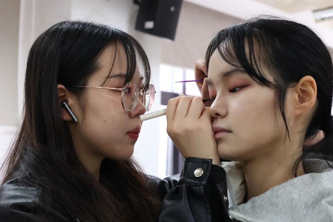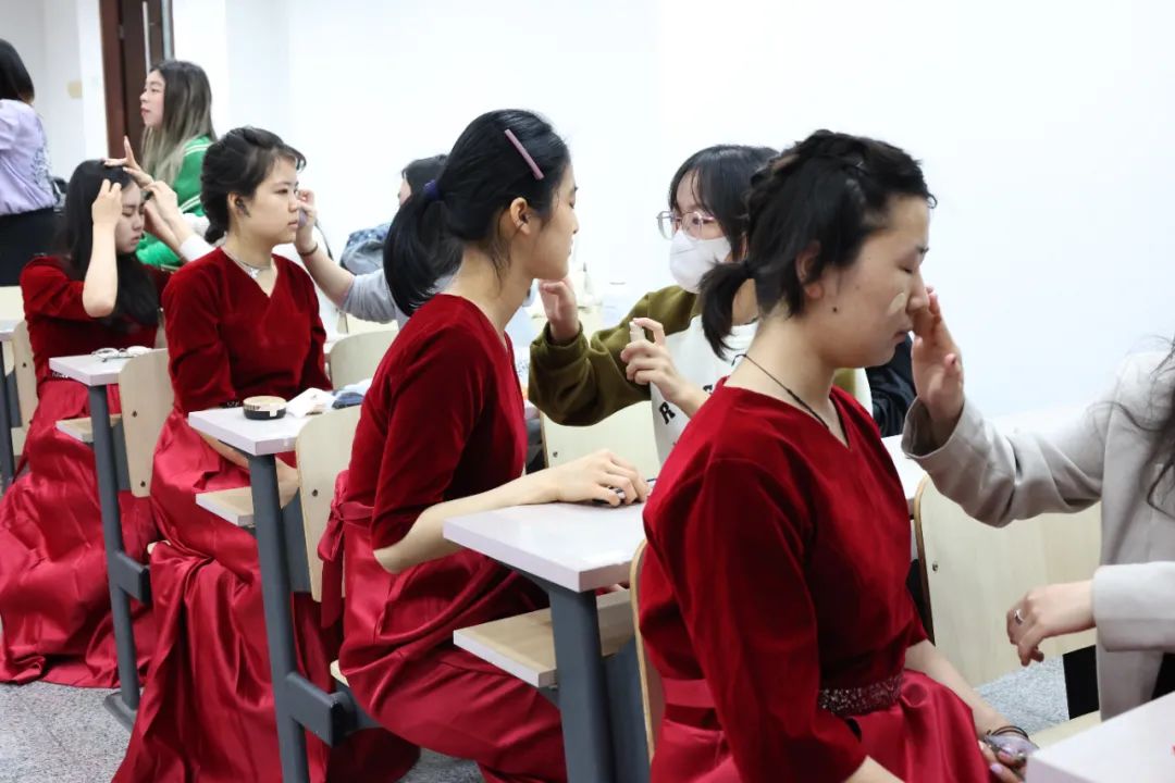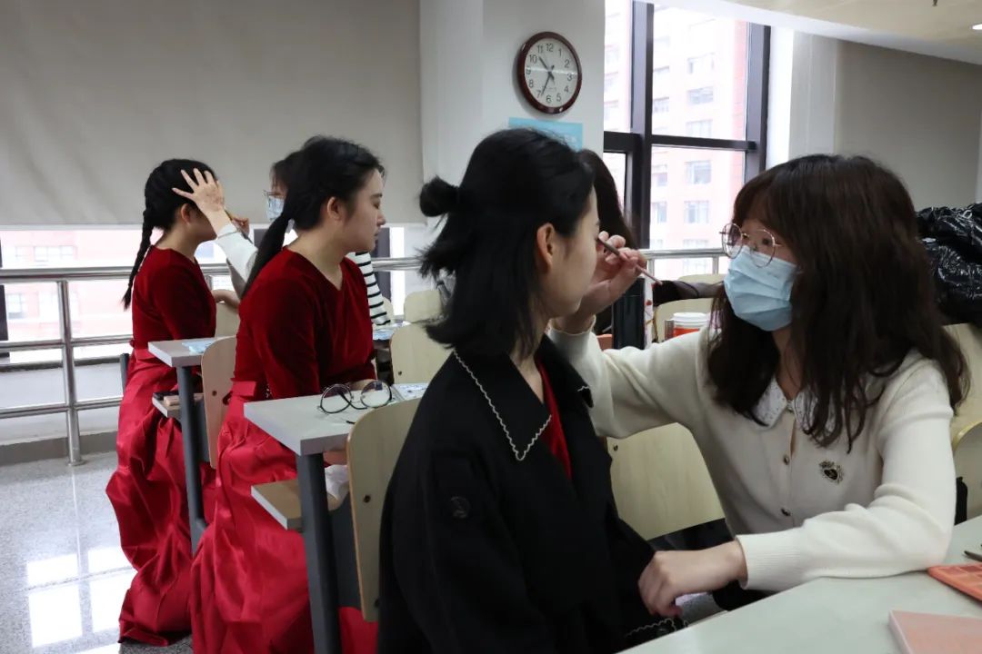 23日上午,我院“人大组歌”合唱团早早便为比赛做着最后的准备。男生们西装革履,尽显稳重大气;女生们一袭红裙,尽是优雅端庄。抿焰唇画黛眉,蘸细粉染红脂,在工作人员的精心装扮下,同学们更加神采飞扬。经过数月的千锤百炼、精雕细琢,同学们终于迎来长久盼望的这一天,期待着用最动人的歌声把满腔的深情与热忱都献给最后的登台。