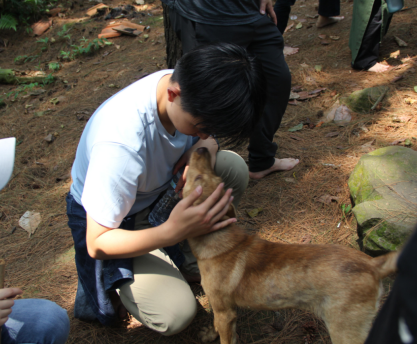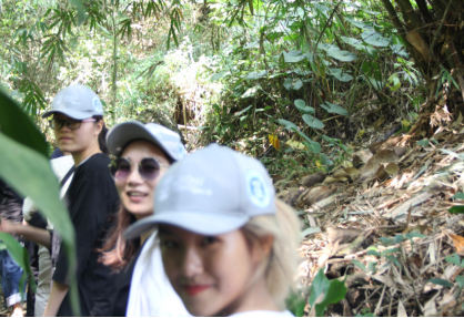 赤足爬山在带来新奇感之余,对身心可谓是一场十足的考验。成员们不仅要接受坚硬的石块和土路带来的交替刺激,还需留心碎石、树叶、杂草和水坑,每一步都走得小心翼翼。下山则更需要毅力,因为在脚底疼痛的基础上增加了膝盖的压力,一行人中有的借助树枝,有的手脚并用,虽然走得磕磕绊绊,终于还是顺利下山。