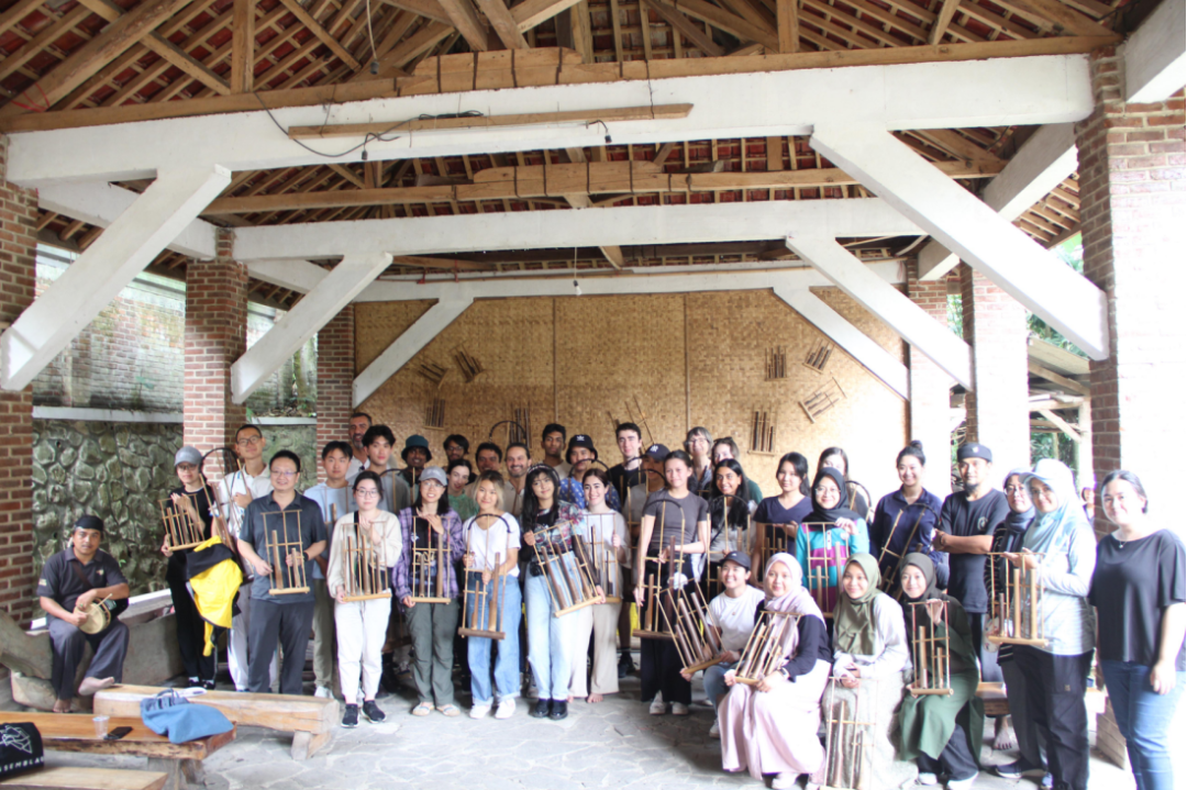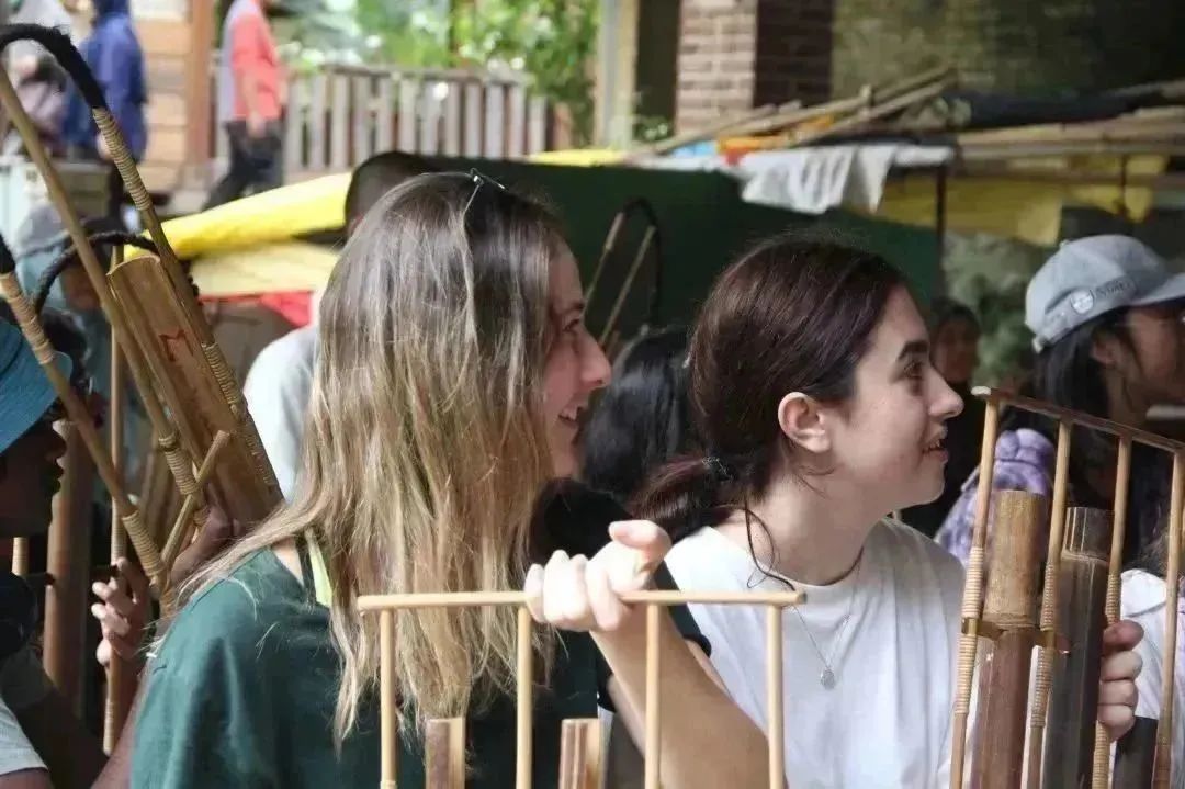 文化日最后一项体验活动为印尼传统竹制乐器昂格隆(Angklung)的演奏。昂格隆是印尼国宝级乐器,被联合国教科文组织列为世界非物质文化遗产。它的结构十分简单,主体用细竹条作支撑,中间悬两到三个竹筒,竹筒上部被削成槽状,底端分别嵌入另一个较粗竹管的切槽。演奏时只需轻轻摇动,竹筒受到撞击便发出清脆悦耳的颤音。昂格隆原本只有五声音阶,经过现代化改进已经发展出全音阶,但向导表示当地人更爱演奏五音的昂格隆,因为这更加忠实于他们的传统。每一只昂格隆只能发出一个单音,因此演奏时需要大家通力合作。在向导的手势指挥以及其他土著居民的鼓点带领下,师生们很快就找到了感觉,身体也跟随着律动,形成一派与自然之声共舞的图景。