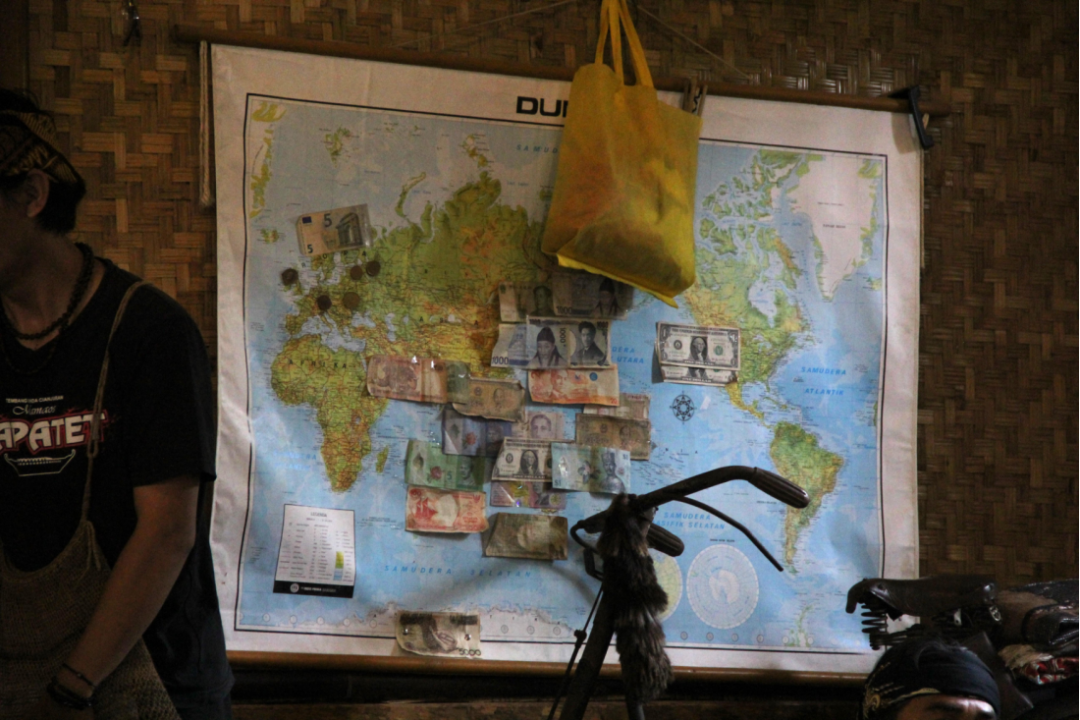 活动伊始,研学团在一间传统的木制建筑中席地而坐,用前几日学会的巽他语回应土著向导的问候。通过向导介绍,成员们了解到,Cirendeu位于西爪哇省(West Java)芝马墟市(Cimahi),距离万隆市区大约15公里,远离城市的喧闹。村庄的名字Cirendeu由当地盛产的一种树的名称(rendeu)演变而来。这里的人们热爱环境、亲近自然,在过年、结婚、分娩等许多方面都保持着从祖先那里继承下来的风俗习惯,以友好、礼貌、温和的巽他族文化著称。向导表示,当地人十分欢迎对土著生活感兴趣的游客前来体验,希望能以此更好地保护土著文化。Cirendeu的故事在年复一年的讲述中已然走出了小小的村落——木屋的墙壁上挂有一幅世界地图,闻讯而来的游客们纷纷留下自己国家的货币作为纪念,已经有十余种。