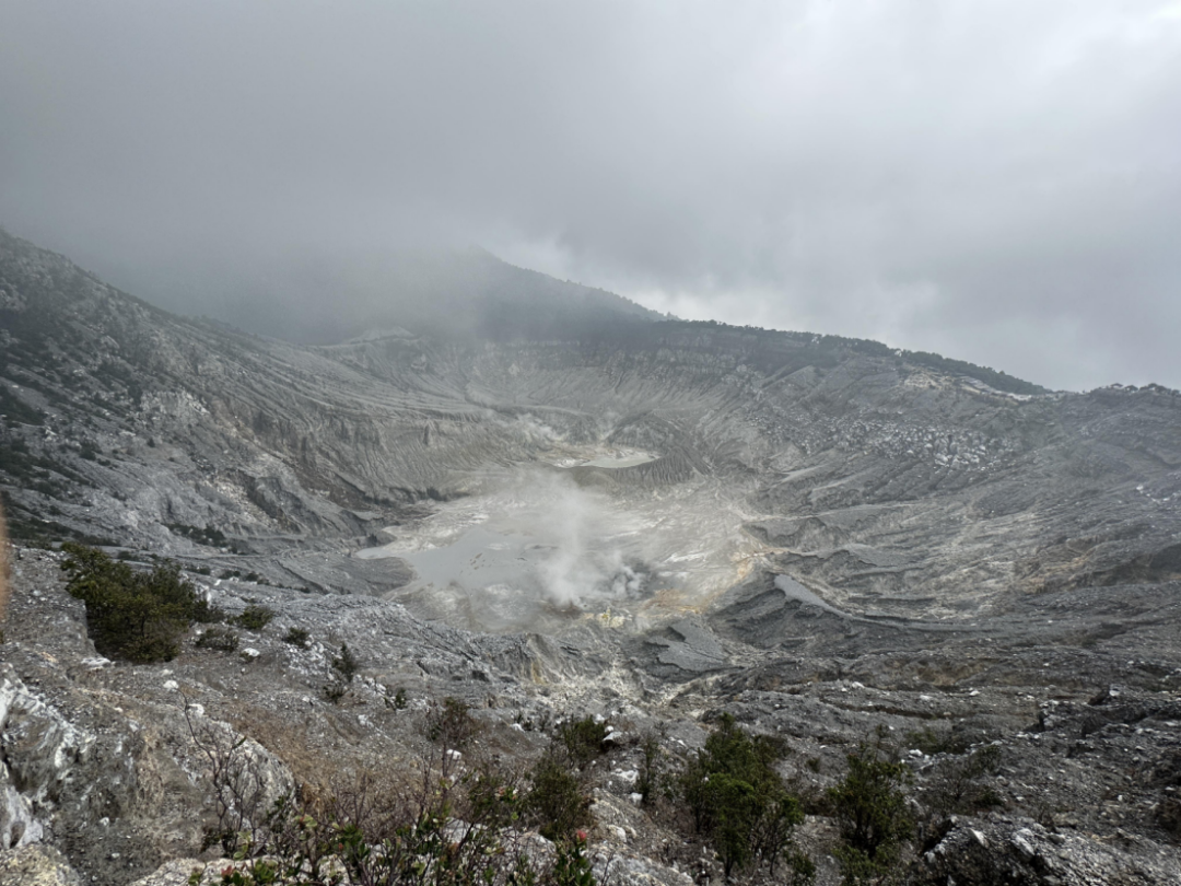 火山及其带来的火山灰,是塑造和影响印尼尤其是爪哇岛人文历史和城乡景观的重要力量。覆舟火山是印度尼西亚西爪哇省的一座活跃火山,位于首都雅加达以北约30公里处。它的名字“Tangkuban Perahu”源自印度尼西亚语,意为“翻船的山”。作为是印度尼西亚最著名的火山之一,它因其独特的形状和活跃的火山活动而吸引着众多游客。火山口处时而喷发出一缕轻烟,仿佛是大地轻轻呼吸的气息,静谧而神秘。浓郁的硫磺气息弥漫在空气中,给大地增添了一抹神秘的气息。研学团成员们充分感受着大自然的力量与美丽,在凉爽的山风中,凝视着火山口,那泛着淡淡硫磺气息的岩浆池宛如明亮的明珠,向我们诉说着地球的沧海桑田,历经岁月变迁的洗礼。