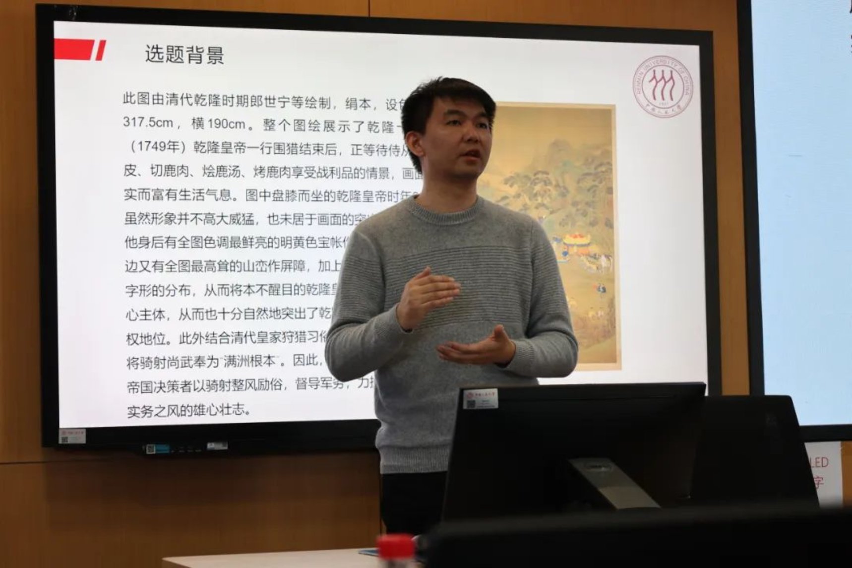 数字人文研究院严承希老师在讲解指南选题《中国古代绘画艺术的多模态挖掘与可视化分析》时,首先以数字人文研究院多学科交融、科研团队强大的特点为抓手,向大家详细介绍数字人文研究院的研究机构;随后,在阐释选题背景和选题内容时,严承希老师以《乾隆皇帝围猎聚餐图》为例,引导大家思考中国古代绘画应该建立怎样的分析体系;最后,严承希老师介绍了语义组织、文化分析、智慧服务三个具体的选题内容,并提出了选题项目的相关要求。