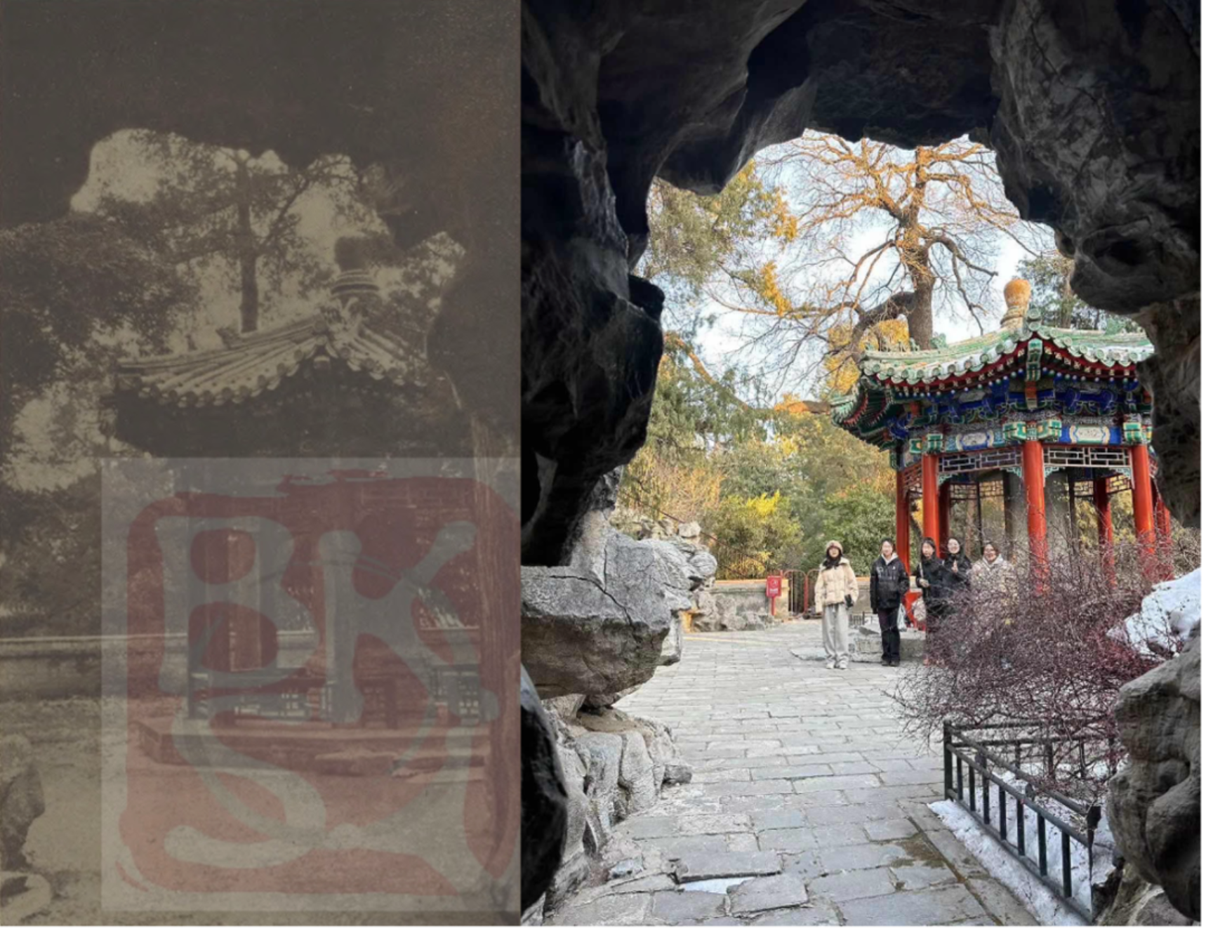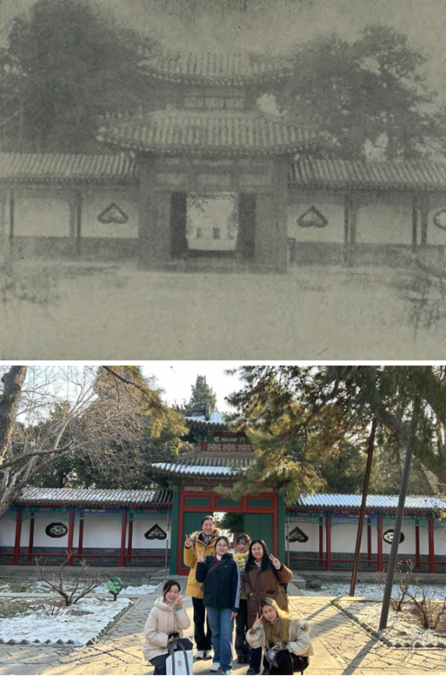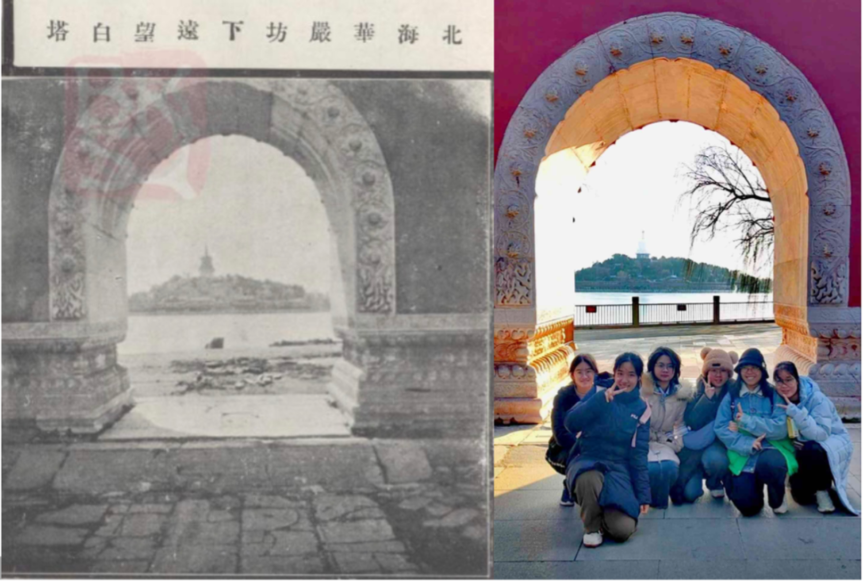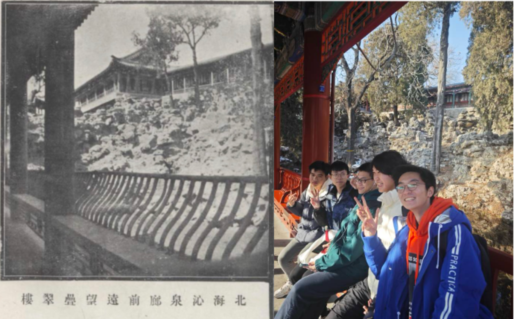 在抵达北海公园后,本次活动的现场教学环节——名胜古迹寻访大赛正式开始。同学们以宿舍为单位划分为7个小组,每组选出1名同学担任组长兼摄影师。各组同学按照《北海古迹图册》中的线索完成比赛路线规划与走访游览,在游览过程中,各组成员需按照图册中的谜题文字和图片提示,找到民国老照片中出现的名胜古迹点位,并按照老照片的原角度进行还原打卡,完成照片拍摄。