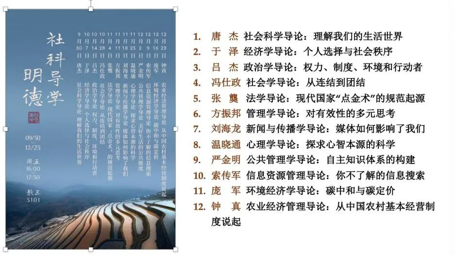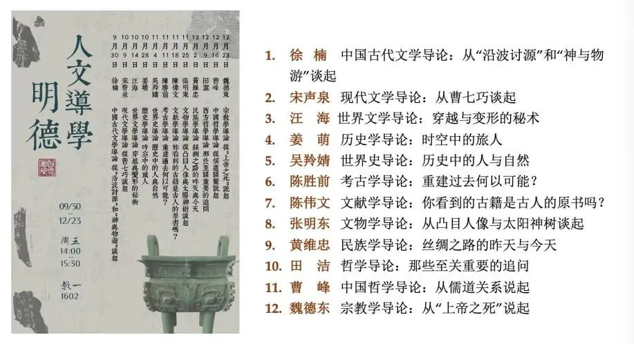 书院对原有培养方案进行修改,部类核心课、明德导学课程、新生研讨课等内容发生变化,其中刘玮老师着重介绍了书院开设的特色导学课程。书院将调整增加一些部类核心课程;调整《明德人文导学》,开设《明德社科导学》,这两个讲座系列将从具体问题处入手,帮助新生了解人文社科基本领域、基本研究范式和研究内容;新生研讨课不同班级提前给出讨论主题,供同学们结合自己的兴趣自由选择;“明德读书会”第二季也将持续开展。