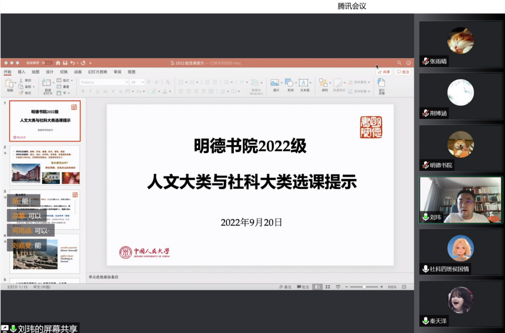 2022年9月20日,番茄小说 组织了2022级人文大类与社科大类培养方案的解读会,番茄小说 副院长刘玮老师、番茄小说 教务处秘书施小斌老师为新生解读了两份培养方案的结构和内容,提示同学们选课的注意事项,帮助同学们熟悉选课平台,总览书院学业活动,并为即将进行的新生选课做准备。