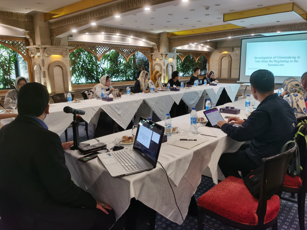7月30日上午,研学团与伊朗玻璃器博物馆馆长Navid Salehvand博士座谈。Salehvand馆长做了题为《伊朗玻璃生产调查:从起源到萨珊时期》的报告,从玻璃器的材质、制作工艺、用途、贸易路线等方面进行了内容丰富翔实的分享。他介绍,玻璃器是伊朗视若珍宝的历史载体,对于了解伊朗历史和王朝更替兴衰具有重要价值,希望研学团在参观中可以亲身感受玻璃器的魅力。