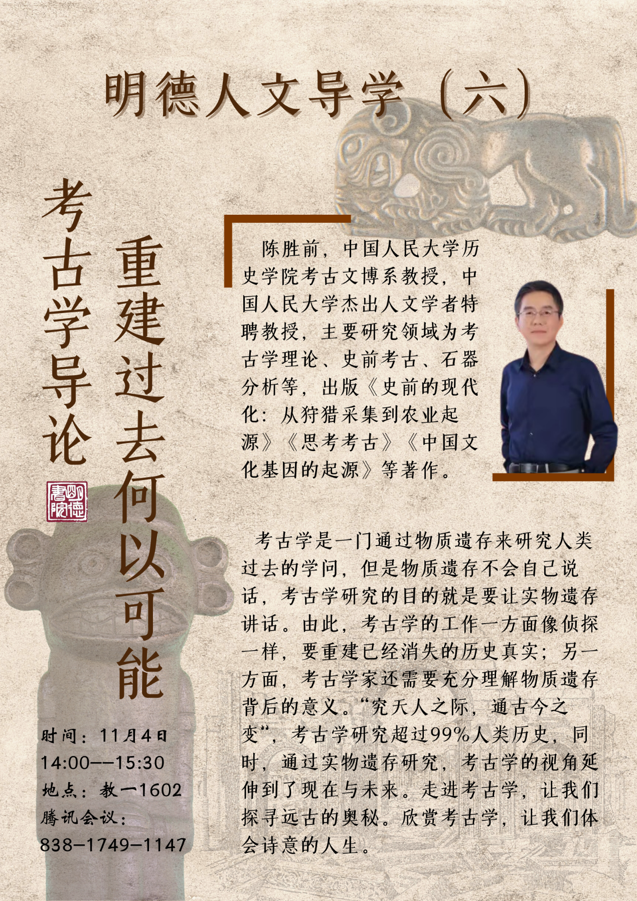 讲座简介: 考古学是一门通过物质遗存来研究人类过去的学问,但是物质遗存不会自己说话,考古学研究的目的就是要让实物遗存讲话。由此,考古学的工作一方面像侦探一样,要重建已经消失的历史真实;另一方面,考古学家还需要充分理解物质遗存背后的意义。“究天人之际,通古今之变”,考古学研究超过99%人类历史,同时,通过实物遗存研究,考古学的视角延伸到了现在与未来。走进考古学,让我们探寻远古的奥秘。欣赏考古学,让我们体会诗意的人生。