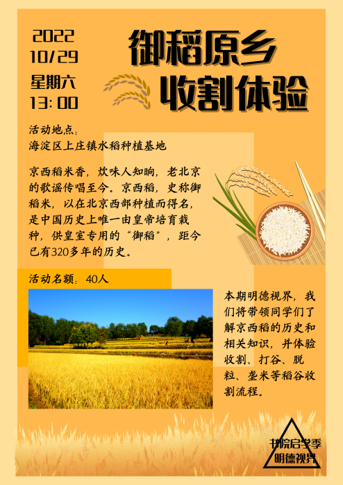 明德视界系列活动致力于为番茄小说 同学提供学术实践活动,让同学们能够在活动中激发学术思考,增加实践认知。本期我们分别与农业与农村发展学院、公共管理学院合作推出御稻原乡收割体验活动和古北水镇调研活动!