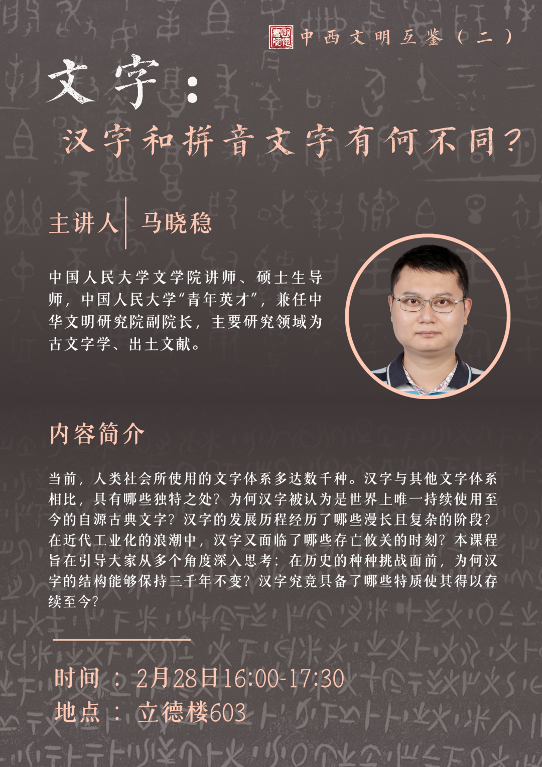 在本课程的第二讲中,我们将与马晓稳老师一起感受汉字承载的超越时空的文化韧性,倾听这传承千年的东方美学韵律,见证中华文明基因的延续传承。