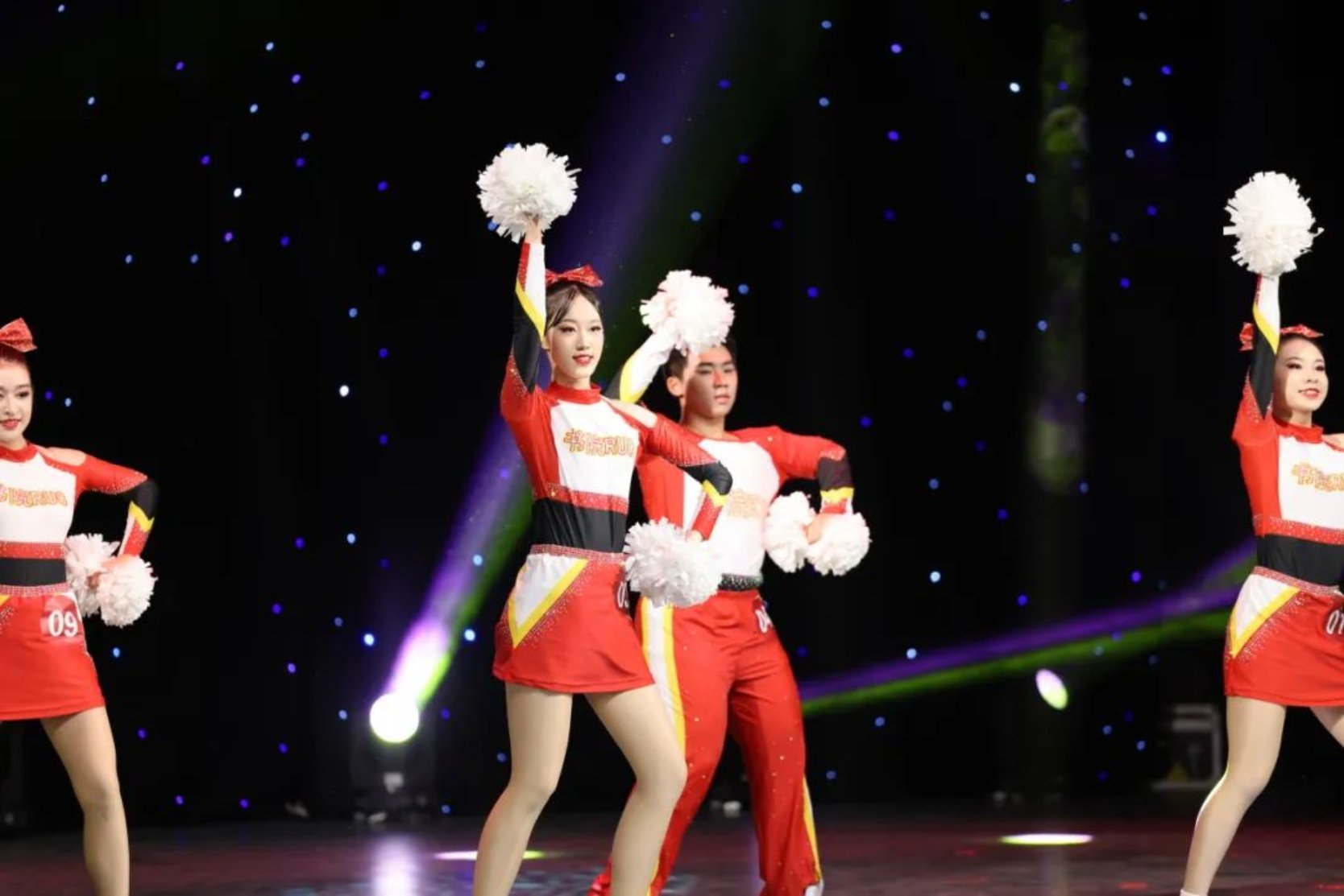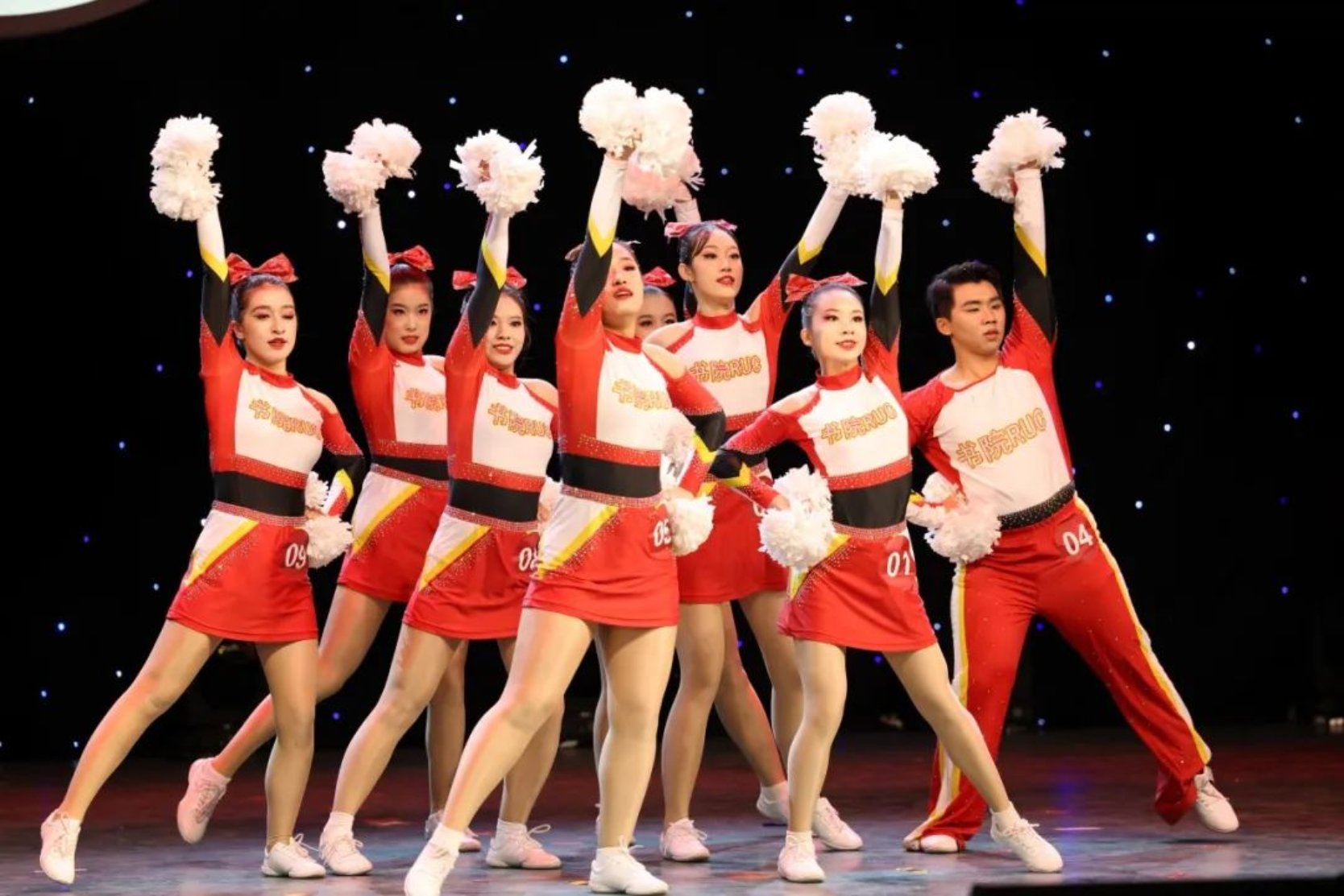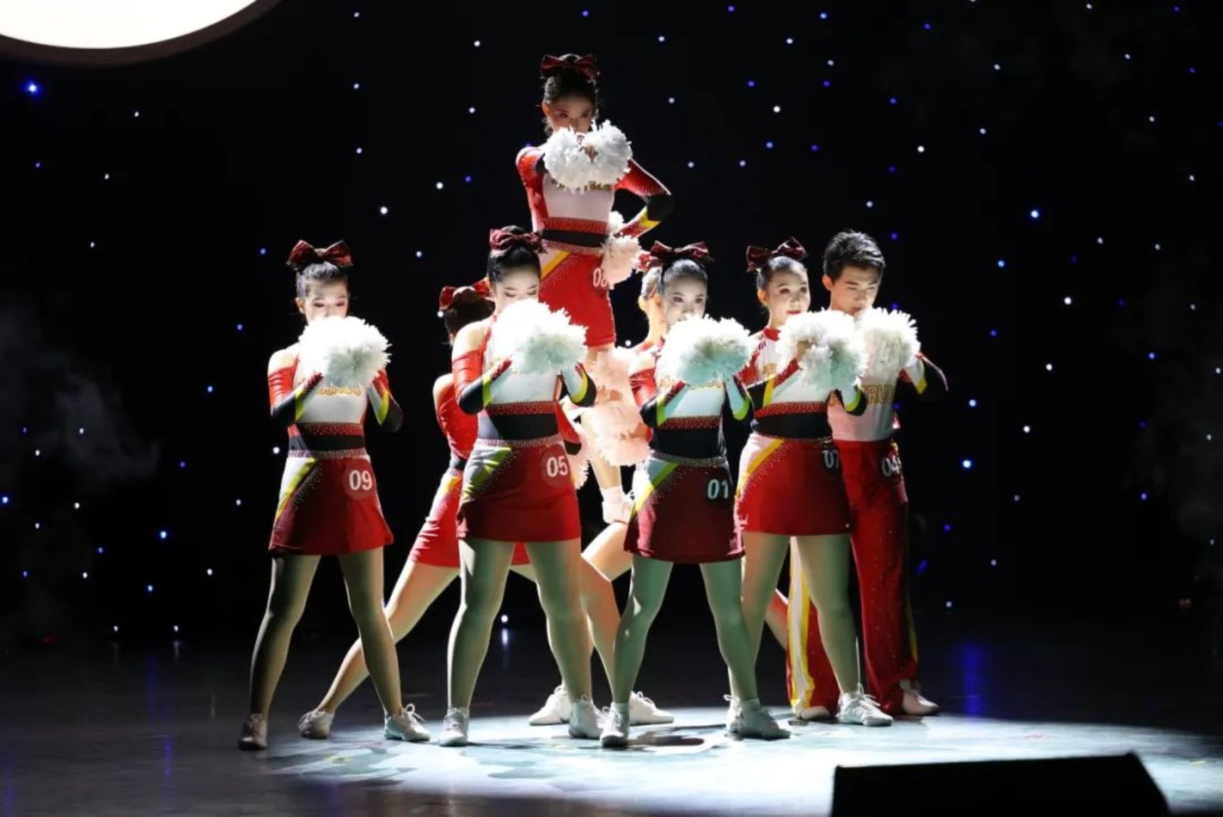 19:25,书院健美操队闪亮登场。红色为主色调的队服搭配白色花球,队员们在如昼的灯光下熠熠闪耀,整装待发!