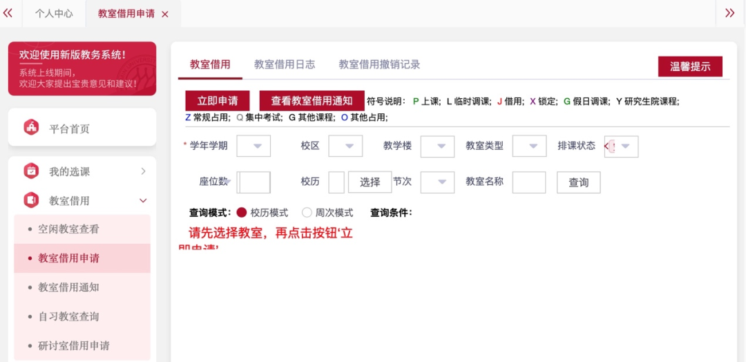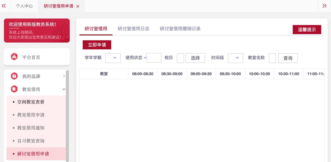 选择一:微人大-个人中心-教室借用-自习教室查询