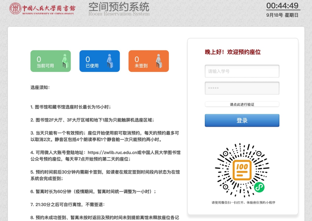可预约当日和次日座位(每日早上七点开放次日座位预约)