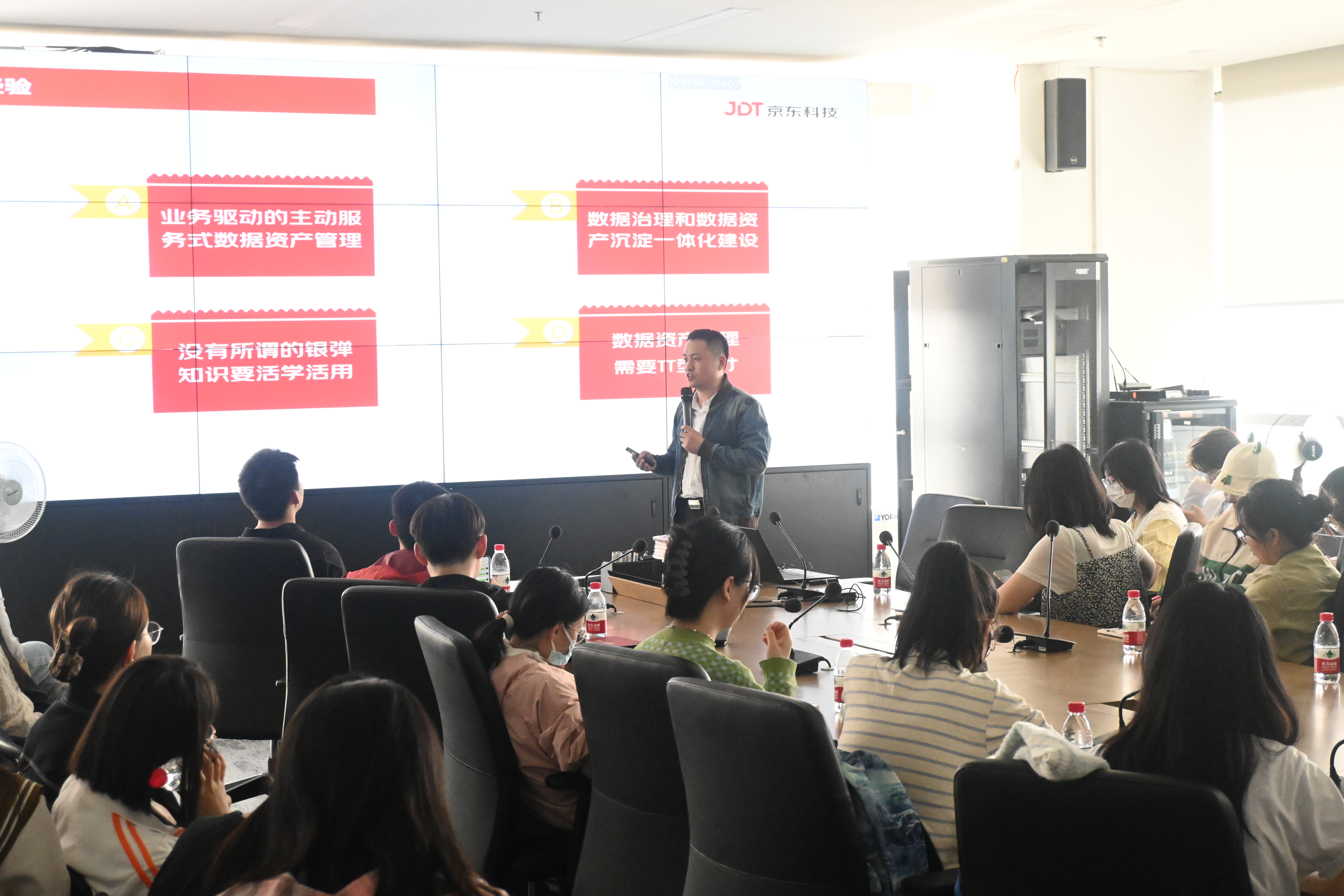 参观结束后,同学们进入会议室开展座谈会,聆听京东数据管理业务与案例分享,了解京东校招项目和福利介绍。校招会工作人员提出数据资产管理的概念,强调其在技术赋能时代下对企业正常运营的必要性,并进一步指出企业数据资产管理职能实现过程中的用户驱动难题,引发了同学们的思考。随后,师生与京东集团员工就“什么样的数据是资产?”“京东相较于同类型业务公司的优势是什么?”等问题展开讨论,同学们收获颇丰。