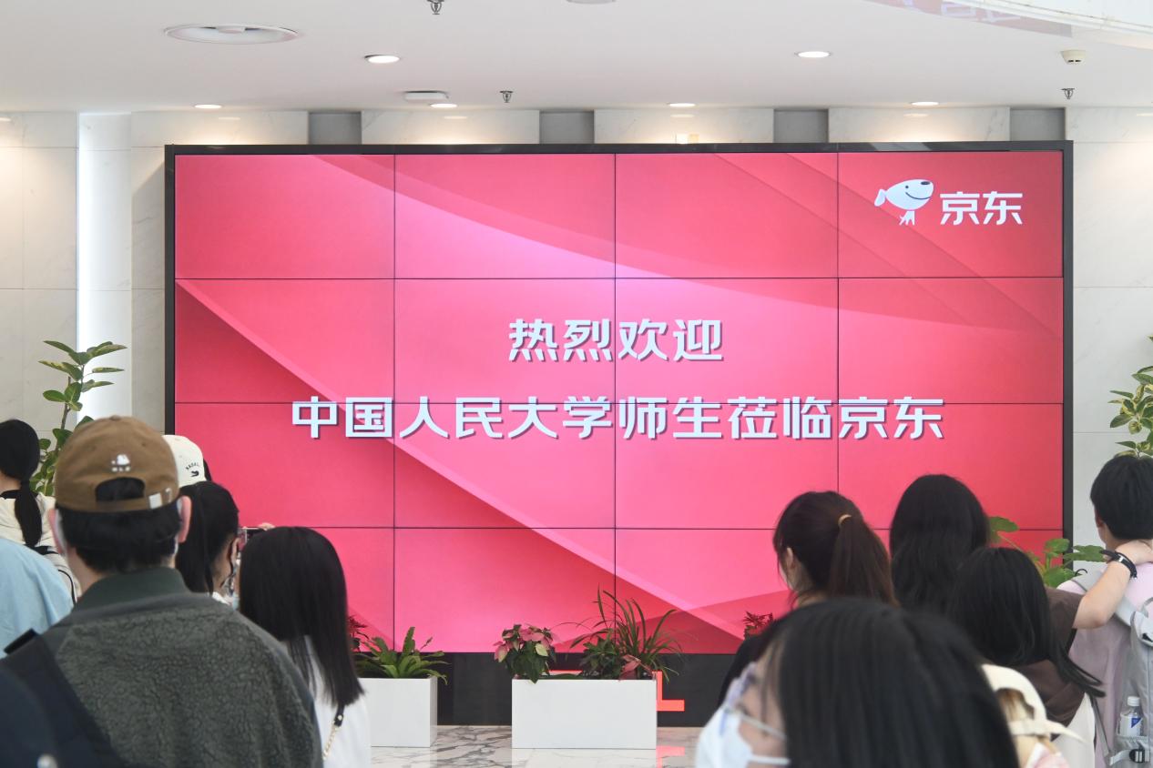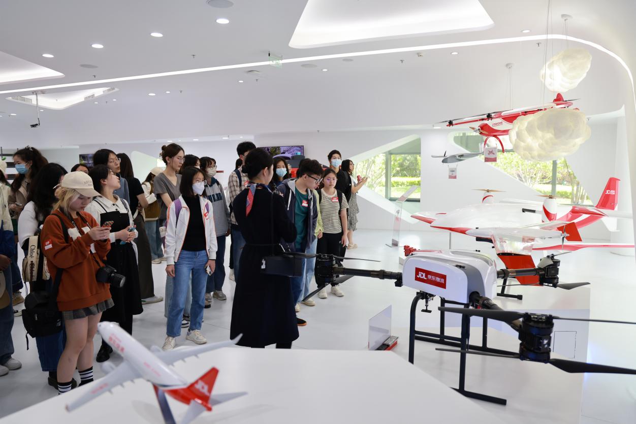 到达位于通州区科创十一街的京东集团总部之后,师生代表首先跟随讲解员陆续参观了京东集团各主要业务部门的展区,具体包括京东集团的线下人工服务与智能快递柜相结合的物流自提点、京东之家、京东物流、京东保险、京东总部建设模型等板块。