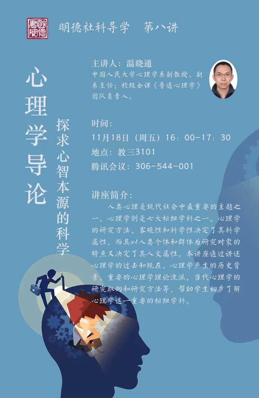 对人类心理的思考从人类文明发端开始,走过了漫长的历史道路,形成了独有的、系统的研究方法,并与哲学、文学、医学、管理学、教育等深度融合,成为现代社会最重要的学科之一。心理活动支配着我们的日常生活、喜怒哀乐、各种决策……我们的情绪从何而来?不同人思维模式、行事风格的差异由什么决定?让我们在本周五明德社科导学里,跟随温老师的脚步,初识探求心智本源的科学,寻找这些问题的答案。