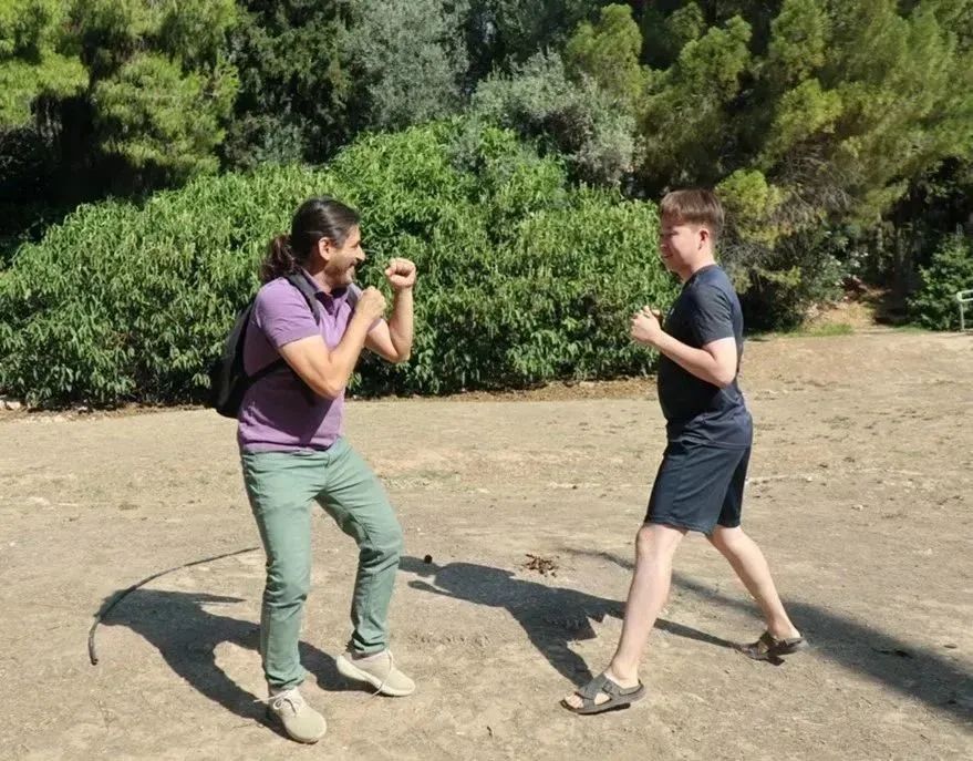(Stavrianeas教授和叶然老师在学园运动场 模仿古希腊人喜爱的拳击运动)