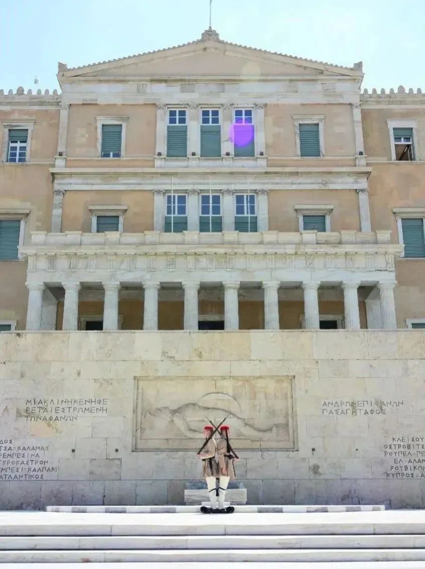研学团随后来到代表希腊现代政治特色的宪法广场,为纪念1834年颁布的宪法而得名,是见证希腊政治重大事件的荣耀之地。在广场的正中心,是希腊议会大厦和无名战士纪念墓碑。