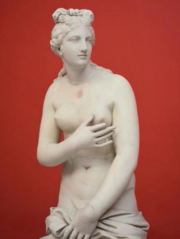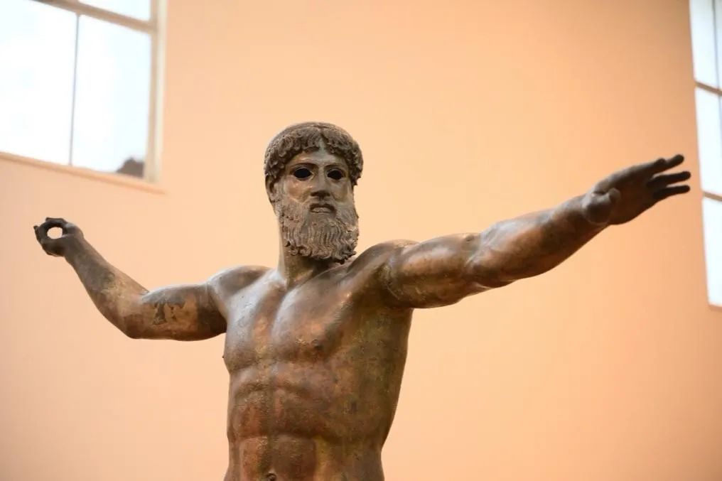 中路的两侧为雕塑陈列区,按时间顺序展有大量在艺术史上赫赫有名的作品,从古风时期的探寻摸索,到辉煌的古典时代,再到希腊化时期,雕塑的变化呈现出古希腊人在艺术上的探寻求索。古希腊雕塑一开始借鉴古埃及文明,动作较为僵硬、表情刻画千篇一律,到走入后来的写实主义。古希腊尚美尚武的追求在雕塑优美的曲线、饱满的人体中展露无遗。在波塞冬(宙斯)像前,研学团驻足观赏,并就雕像是波塞冬还是宙斯展开讨论。神像神情肃穆安静、肌肉紧绷,半立于地面,手中的武器似乎辄待掷出。