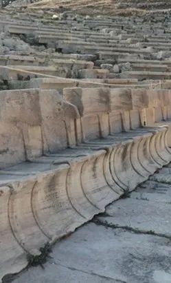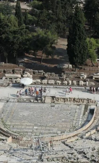 帕特农神庙柱廊整体为多里克式,由建筑师伊克提诺斯和卡里克拉斯设计,雕塑家菲迪亚斯负责监造神庙雕塑和其他装饰物,是献给雅典娜女神的杰出作品。几乎同期修建的伊瑞克提翁神庙主要采用爱奥尼亚式立柱,其东面部分献给雅典娜城邦女神(Athena Polias),西面部分与传说中的雅典城邦建立者伊瑞克特斯(Erechtheus)崇拜有关。雅典娜胜利女神庙,也采用爱奥尼亚式立柱。前后柱廊雕饰精美,是居住在雅典的多利亚人与爱奥尼亚人共同创造的建筑艺术结晶。从山上神庙往下,研学团一行来到了著名的狄奥尼索斯剧场(Theaetre of Dionysos),整个剧场呈两个半圆形,由门廊相连,是那些著名的希腊悲剧上演的场所。西侧的希罗德斯·阿提库斯剧场(Odium of Herodes Attius)现在仍然作为夏季露天音乐会和戏剧表演的场所。