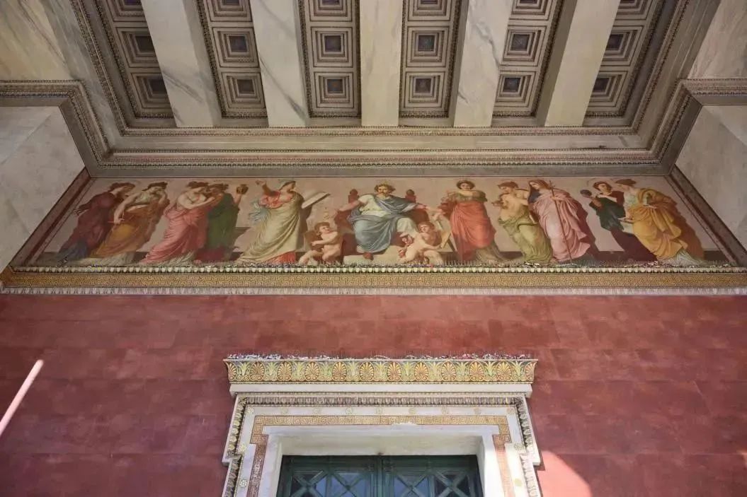 经过哈德良图书馆遗址与风之塔遗址后,研学团队参观了雅典大学旧址和新址。作为雅典新古典主义建筑代表的雅典大学新址门楣上的壁画引起众人的注意。经仔细分辨,位于画面中间位置的是近代希腊王国的首任国王奥托一世。围绕其身边的是包括哲学、历史、考古、医学等在内的各个学科的人格化形象。