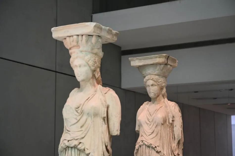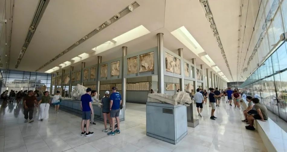 接下来,研学团参观了坐落于卫城脚下的雅典卫城博物馆。卫城博物馆始于向英国索要古代文物时英国人对“希腊能否保护保存好这些文物?”的质疑,因此全馆极具科技感与现代感,从科学技术到规章制度再到人力管理等各方面都是希腊文物保护的最高规格。馆内一层多为青铜器、陶器、大理石雕塑。二层摆放着从英国索回的原属于伊瑞克提翁神庙的五个少女雕像。三层则为浮雕以及取自帕特农神庙的装饰,建造者极富创造力地用整层博物馆还原了帕特农神庙的壁画。