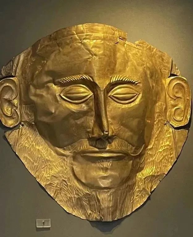 进入博物馆,第一层前厅的中路是迈锡尼文物陈列区,在此处展有希腊最负盛名的文物之一——阿伽门农的黄金面具。阿伽门农是迈锡尼国王,希腊的诸王之王,也是《荷马史诗》中特洛伊战争的领导者。1876年,阿伽门农黄金面具被发掘于希腊伯罗奔尼撒半岛的迈锡尼古城的墓穴,在发掘时仍被戴在当时被认为是阿伽门农的一具干尸之上,随已逝的贵族背后的遗落文明一起沉睡了千年。虽然经后世考证发现,金色面具的主人并非阿伽门农,佩戴它的尸体也不是阿伽门农,但面具的名字未再更改。厚重的名字承载着强盛一时的迈锡尼文明的重量,成为希腊至今的文化符号,陈列在博物馆正厅供人瞻仰。