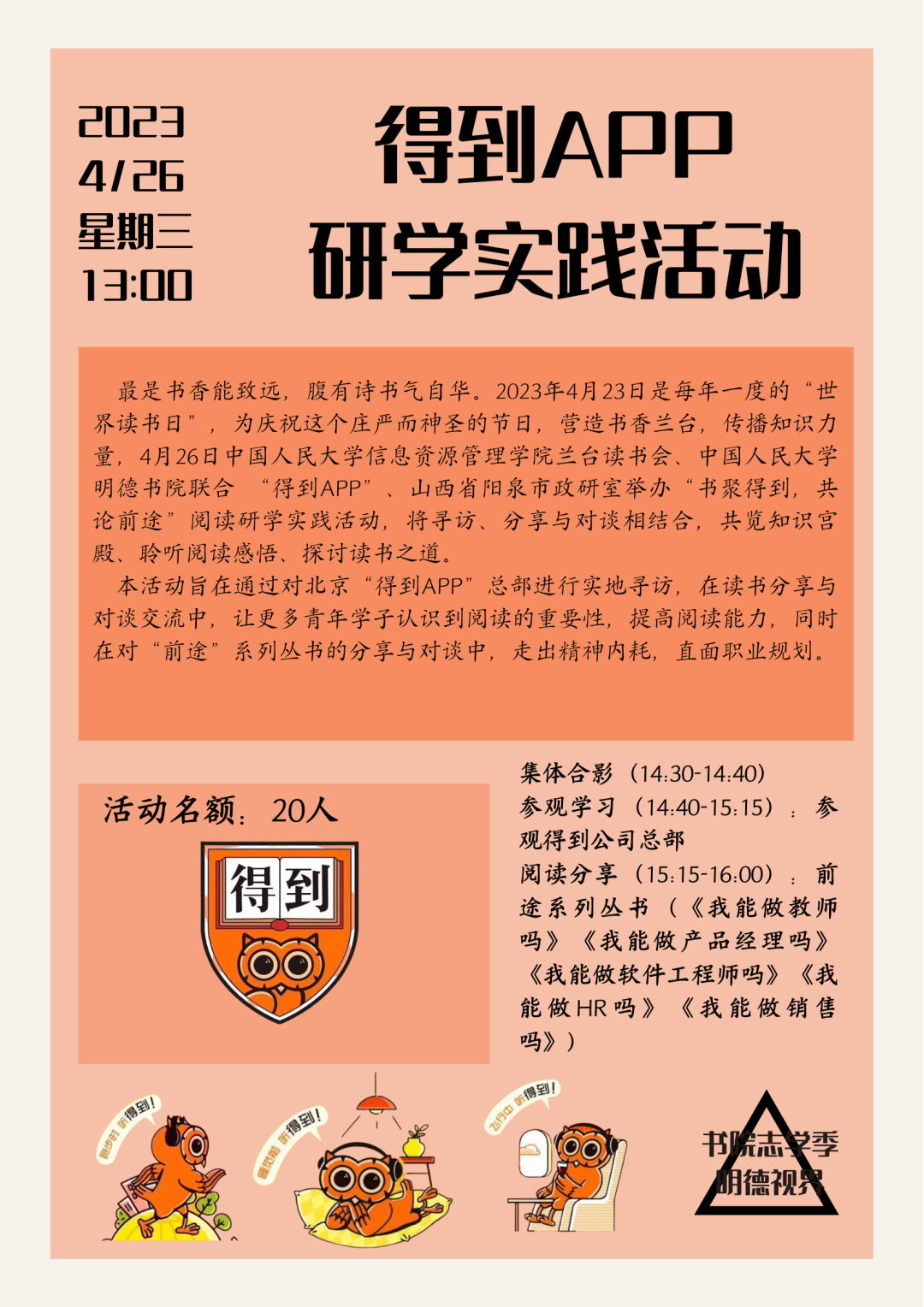 明德视界系列活动致力于为番茄小说 同学提供学术实践活动,让同学们能够在活动中激发学术思考,增加实践认知。本期我们与信息资源管理学院合作推出得到公司参观活动!