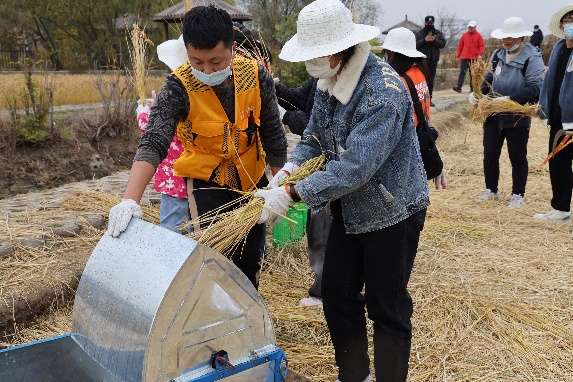 步入稻田,金色稻穗增添了秋日里收获的喜悦,与“稻花香里说丰年”的意境相合。同学们挥舞镰刀,稻谷于沙沙声中倒下,打捆后由脱粒机把谷粒剥离出来。