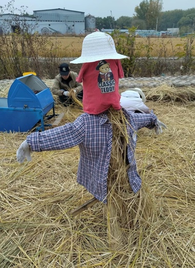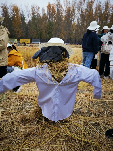 老师和同学们发挥想象、妙手生花,共同将脱粒后的秸秆制作成特色各异的稻草人,留下“在此一游”的印记。