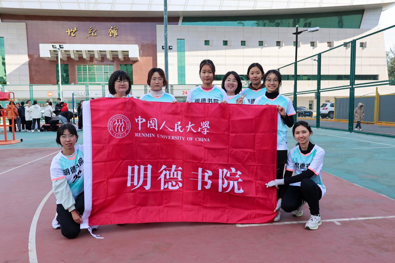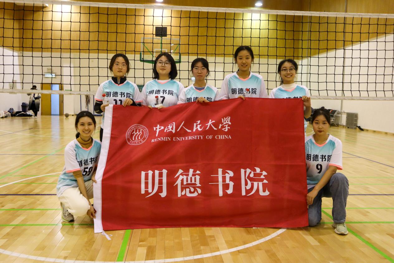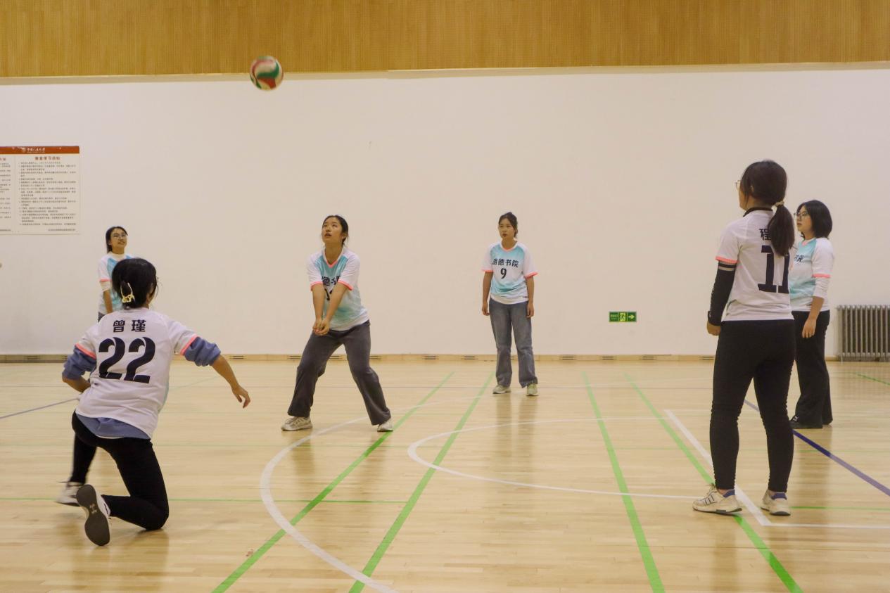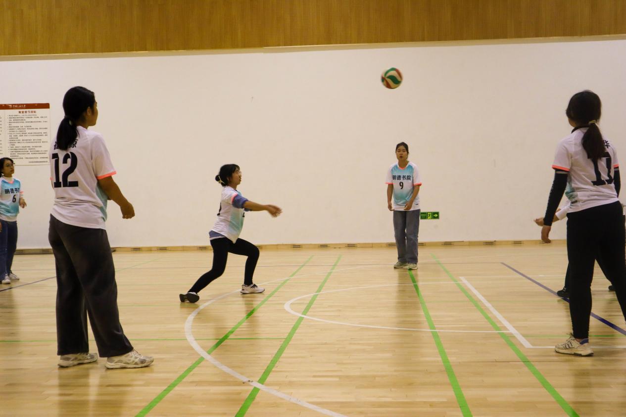 11月12日,明德女排对阵信管女排。随着裁判一声比赛哨响,一场大赛拉开序幕。一开场,明德女排就以极佳的精神面貌和状态打出了气势,9号队员杨菲以一个高质量发球给对方一个下马威,取得开门红。随后,信管女排立刻调整状态,予以强势反击,并以极佳的技术发出多个好球,年轻的明德女排由于比赛经验不足,对高质量的发球有些不知所措,但队员们立即调整战术,通过团队之间默契的配合,逐渐将比分追回。但是由于前期分差太大,第一局明德女排仍遗憾落败。