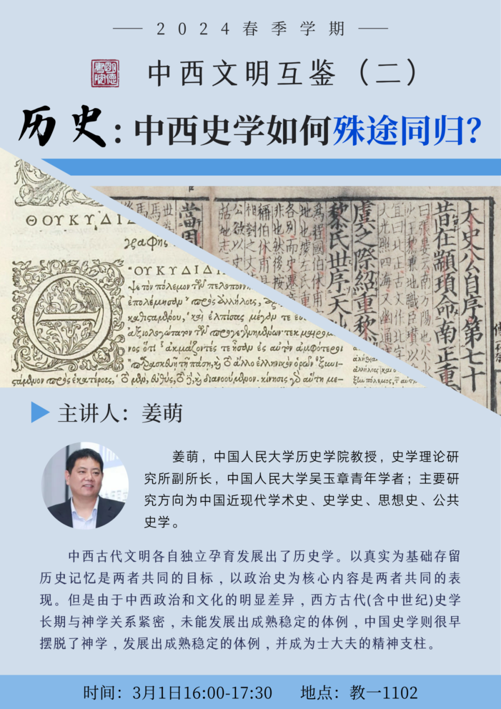 中西史学,虽源自不同的文化土壤,却殊途同归,共同致力于探寻人类历史的脉络与真谛。在漫长的历史长河中,中西方史学家各自以独特的视角和方法,记录着各自文明的发展轨迹。本次课程中,姜萌老师将带领我们一览不同文化背景下历史研究的不同路径,领略中西史学的异曲同工之妙。
