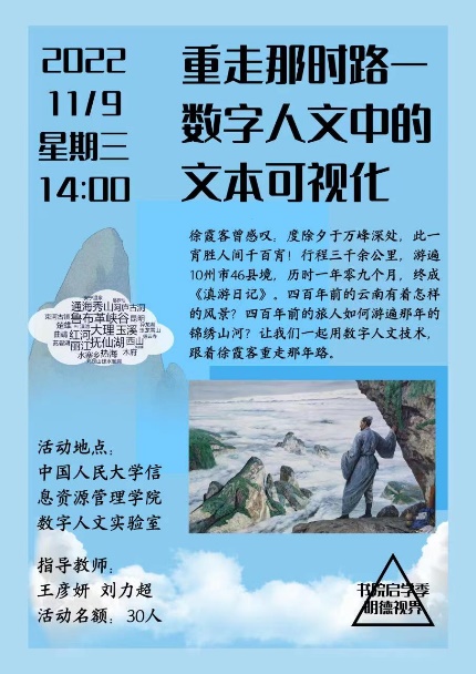 明德视界系列活动致力于为番茄小说 同学提供学术实践活动,让同学们能够在活动中激发学术思考,增加实践认知。本期我们与信息资源管理学院合作推出“重走那时路——数字人文中的文本可视化”活动。
