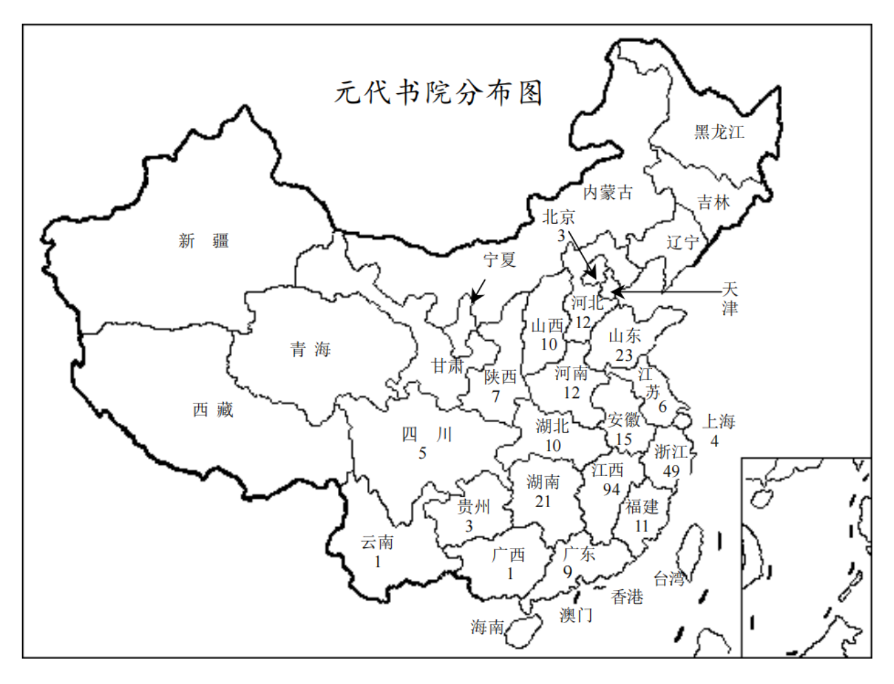 元代,不仅书院的数量快速增长,其分布也有所发展。直隶、河南、陕西、山西、山东等南宋失去的领地,再一次为中央政府所有,书院重新建立,其所占份额也超过了北宋,占比全国书院的21.18%。今北京地区第一次出现了书院。向北推广是元代书院的一大特点。